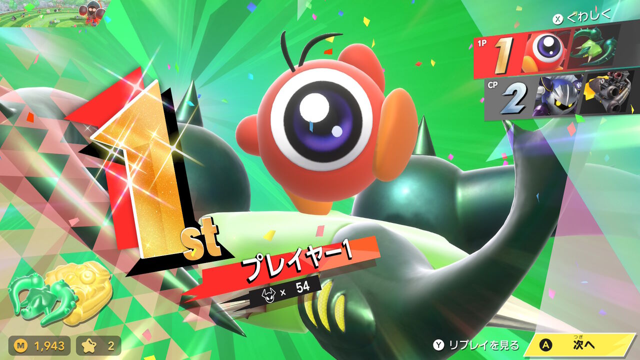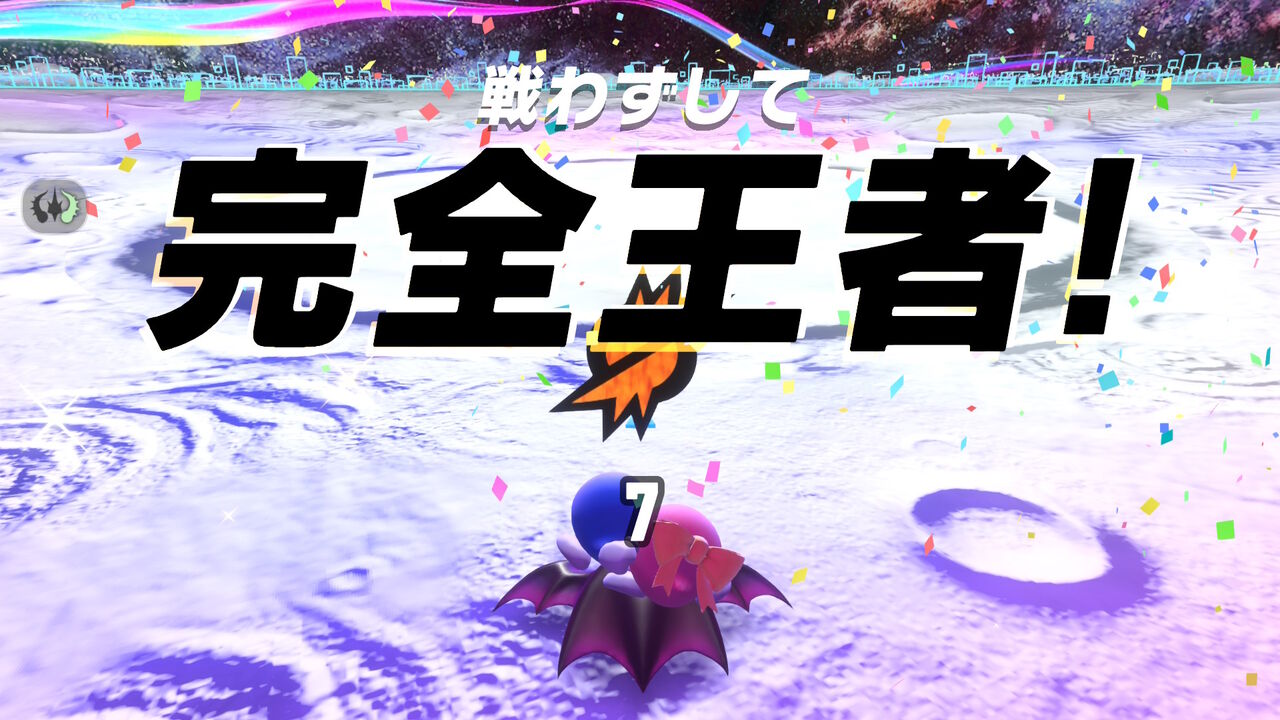 ちなみに一度だけ「戦わずして完全王者!」になった。といってもスタジアムではなく、トライアル中のランダム発生イベント(バトルロワイアル)でだが。スタジアムはCPUがまず確実にプレイヤーが選んだものに引っ付いてくるからほぼ見れないんじゃないかな?ランダムイベントなら稀にCPUが参加しないことがあるので、そうなれば見れる。