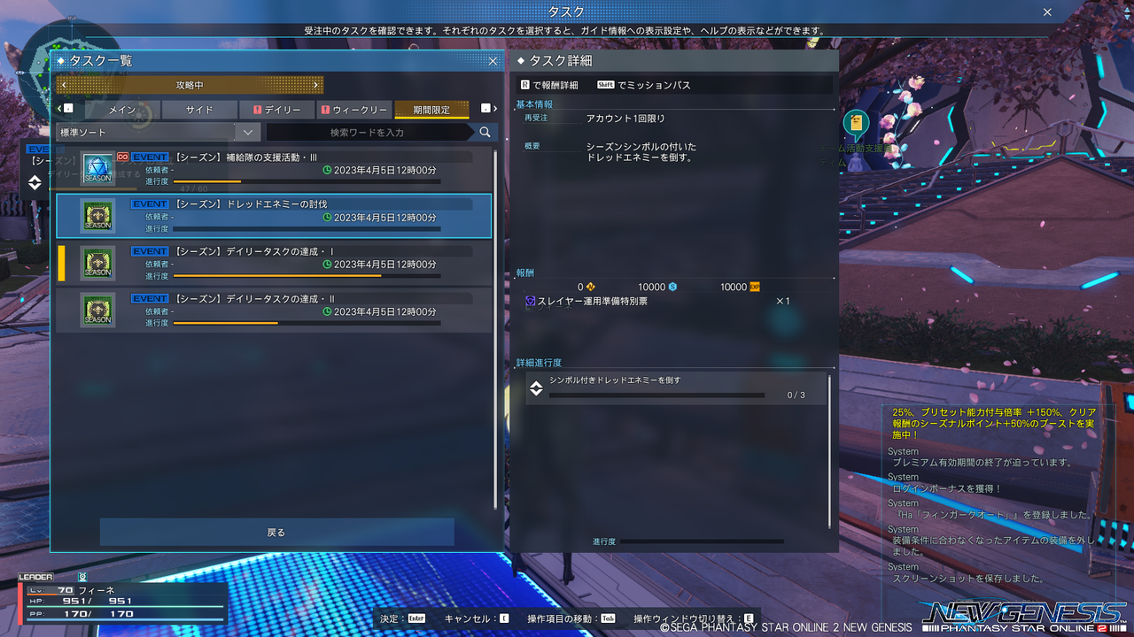 季節イベントの方は後半が来週なので今週は特になにもないが、一応常設クエに各種ブーストがかかっている。獲得シーズナルポイントも1.5倍になっているので、1周で22,000強貰えるように。