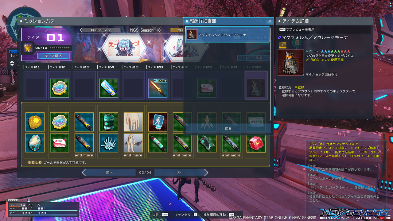 ミッションパスが新しくなったり、SGスクラッチにリファインドフォームのリバイバル(無料なし)が出たり。あとアークスレコード(フィールドレース)も開催。