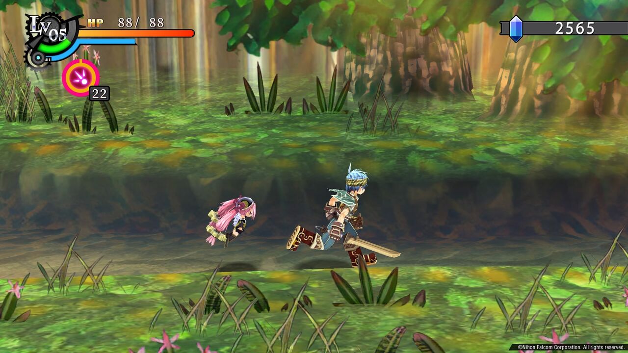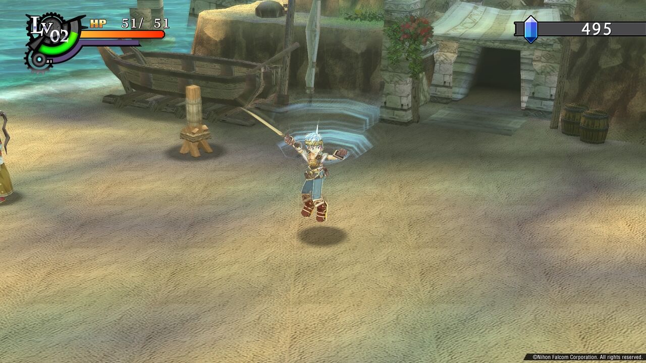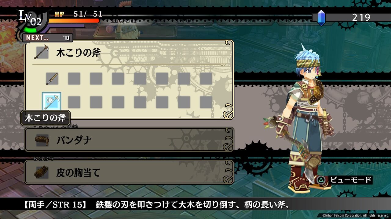 画像でナユタが持ってる「木こりの斧」は両手武器、最初に貰った「ウッドソード」は片手武器と種類が異なる。それぞれでちゃんと通常攻撃のコンボが変化する。