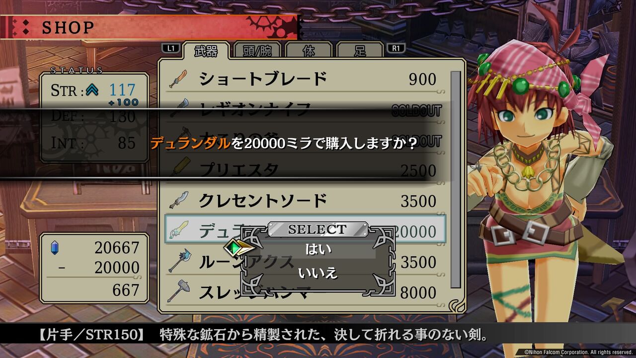 てなわけで貯められそうだったから、他より頭一つ抜けて値段の高い「デュランダル」(片手剣)を頑張って購入。博物館様様である。