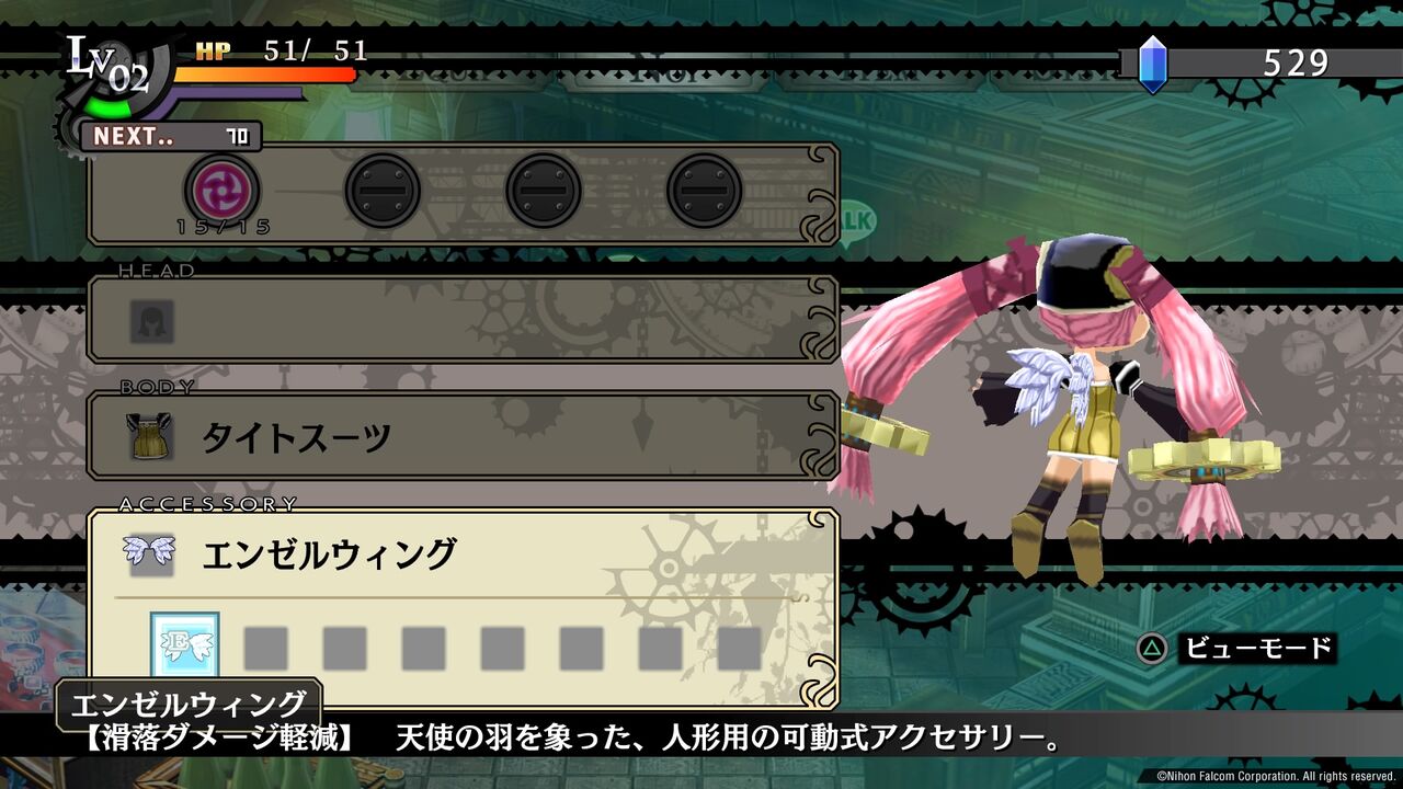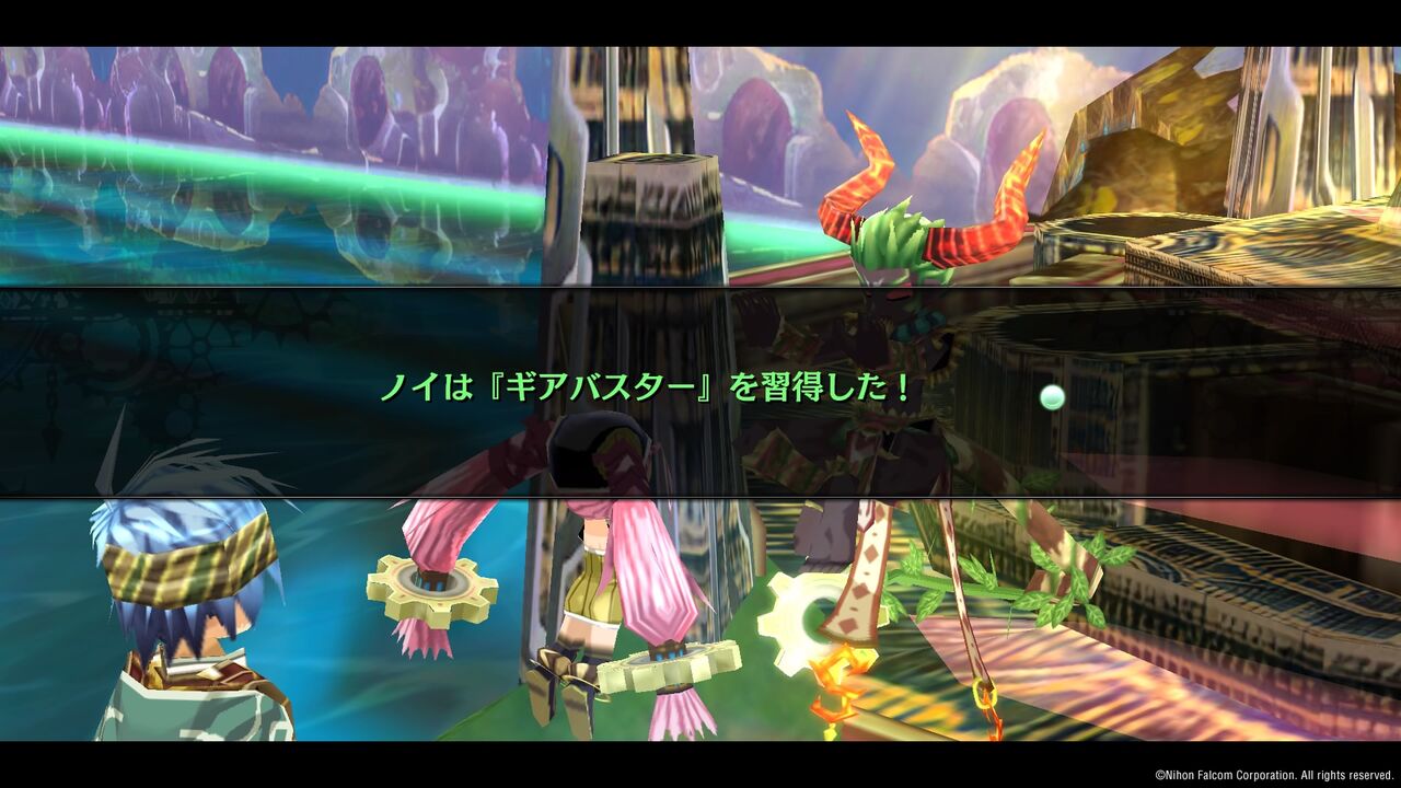 その後新たな技「ギアバスター」を習得。○ボタン長押しでHPゲージ下にある青いゲージを消費して強力な攻撃を発動する。見ての通りノイの歯車が巨大化してヨーヨーみたいな感じで攻撃している。