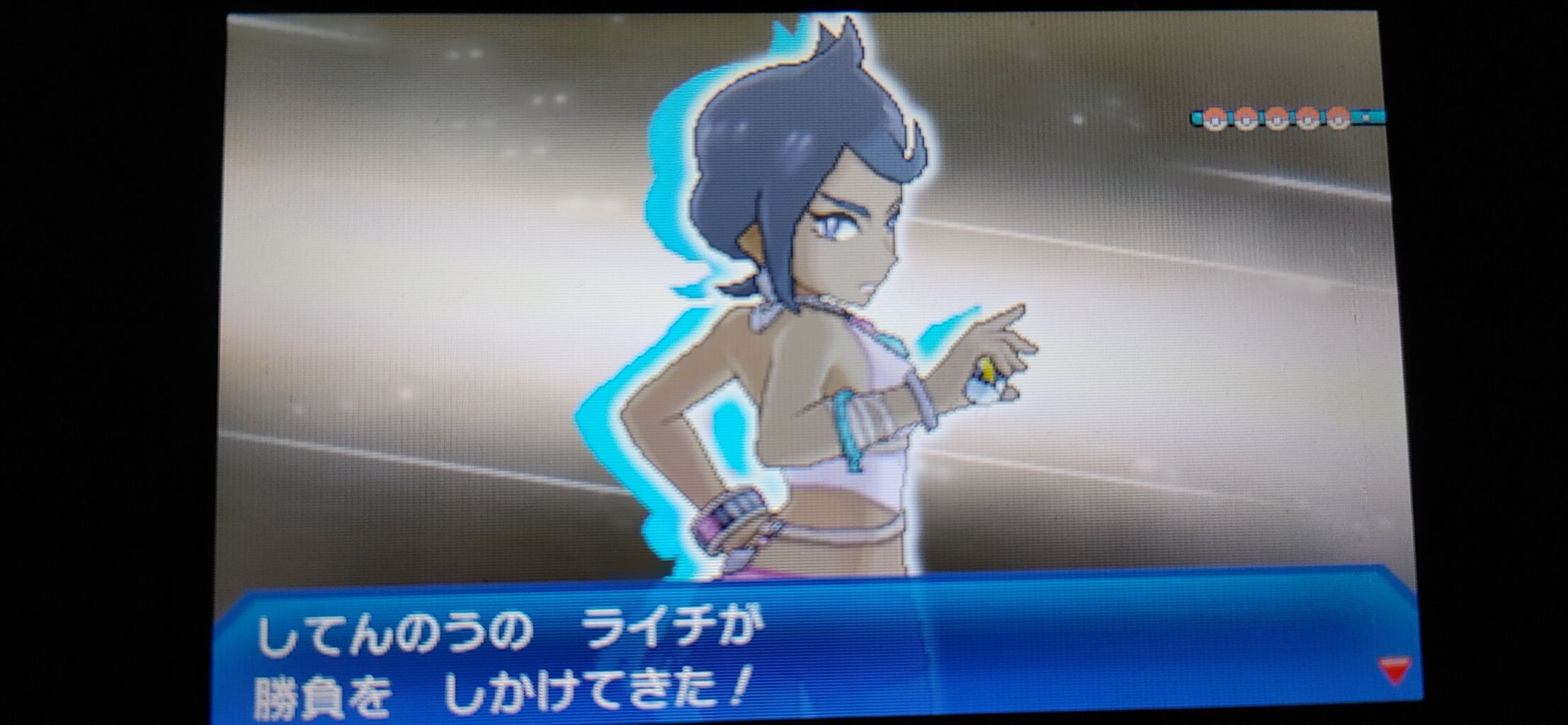 手持ちは「アローラライチュウ」「リーフィア」「ケンタロス」「オンバーン」「ケケンカニ」「ガオガエン」(アシマリを選んだ場合)。中盤くらいまで散々バトルしてたのに終盤にかけてマルチで味方はあったけどバトルはなかったので久々。レベルが60程度になり、ケケンカニを新たに手持ちに加えている。