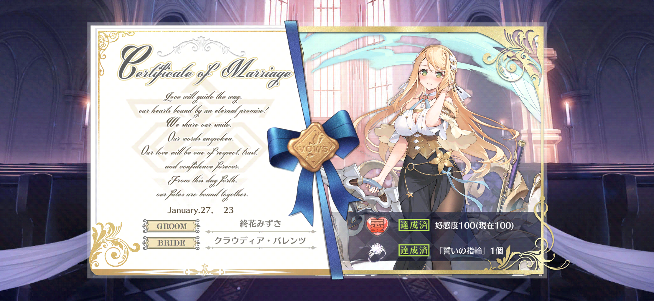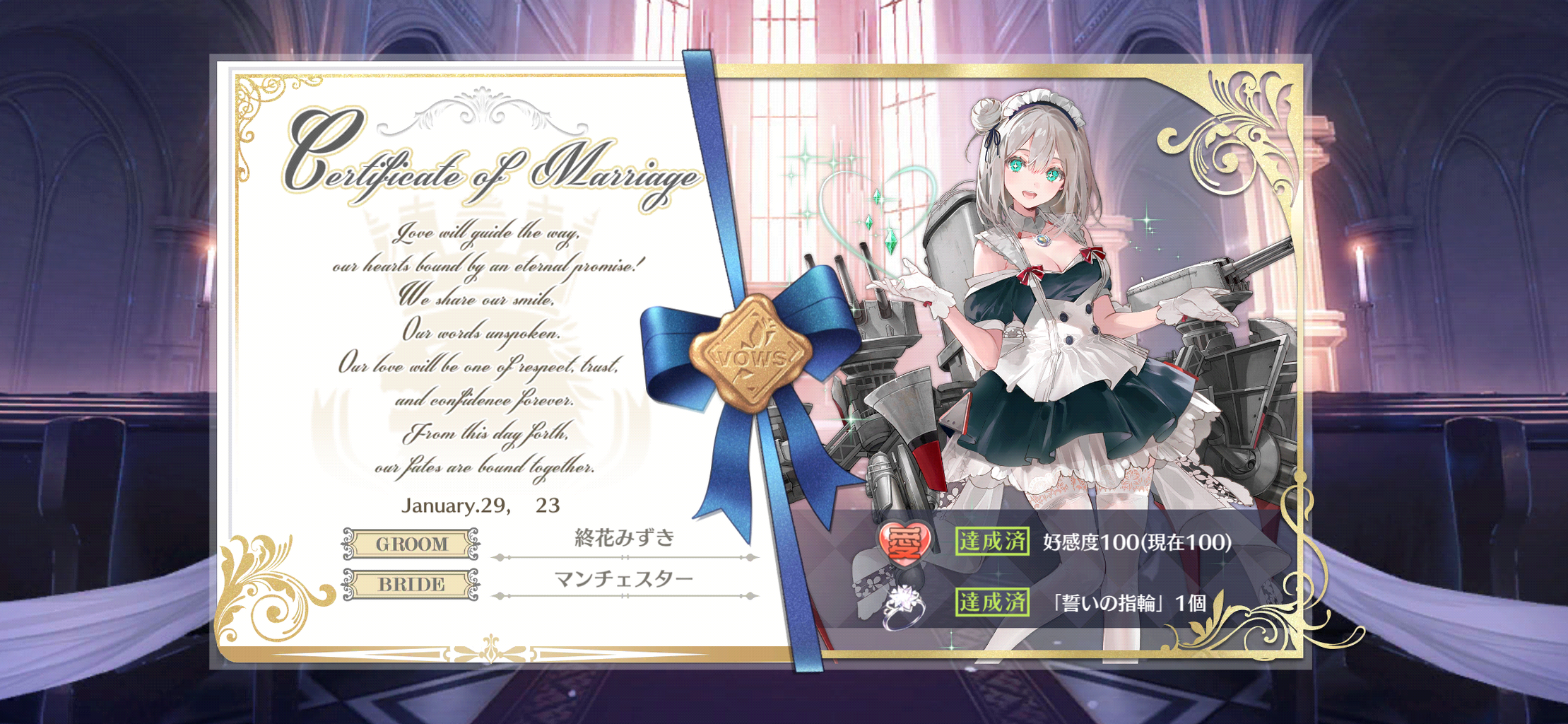 最近育てていた2人とケッコン。共闘イベのおかげかそもそも燃料消費上限のおかげで燃料だだ余りして回しまくっていたからか、平時より結構早くに好感度100までいった気がする。