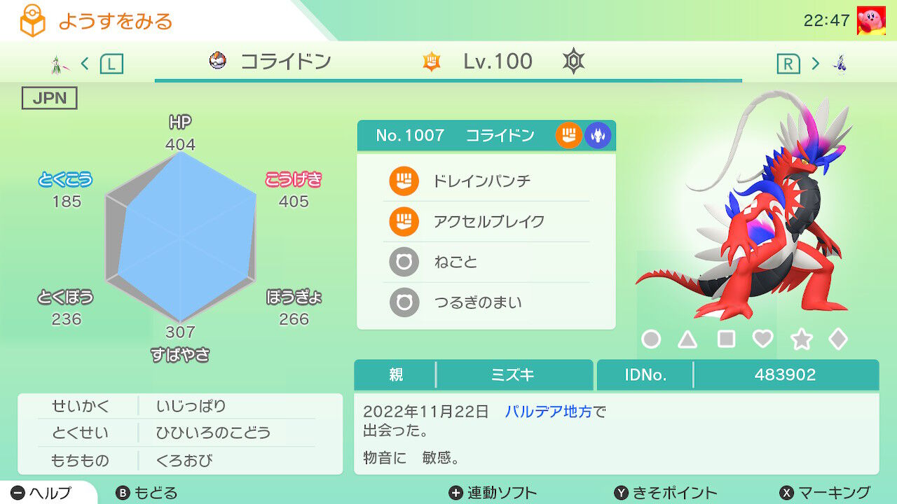 スマホ版の方も新たな実績等が追加されている他、Switch版でSVから1匹でも預けたうえでスマホ版を起動するとふしぎなおくりもので隠れ特性のパルデア御三家を貰える。とくせいパッチを使わなくても遺伝や厳選が出来るようになった。