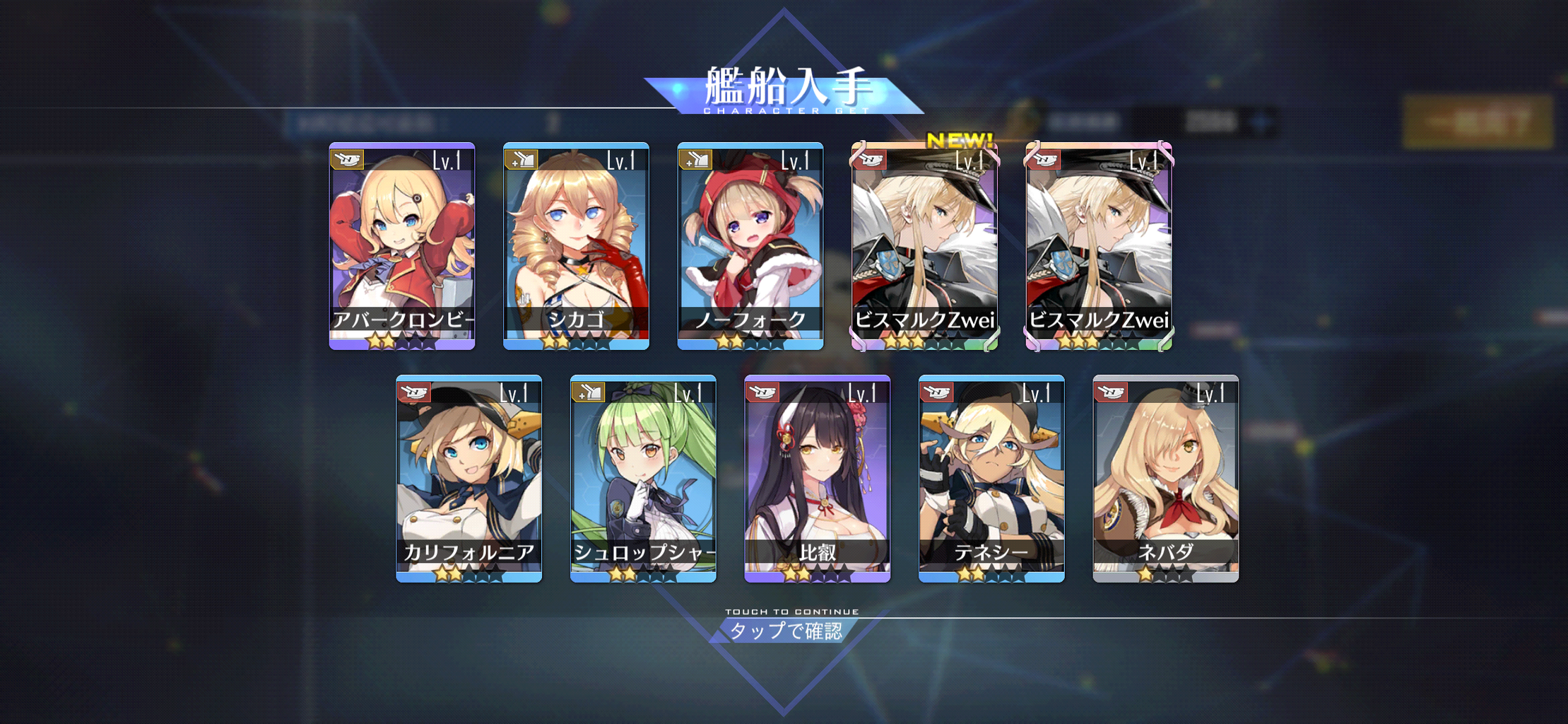 んでまぁ、今回もいつも通りの感じでした。100回で3人揃ったどころか、その100回目に画像の通りビスマルクZweiがツヴァイしちゃった。流石にU-556(META)は出なかった。
