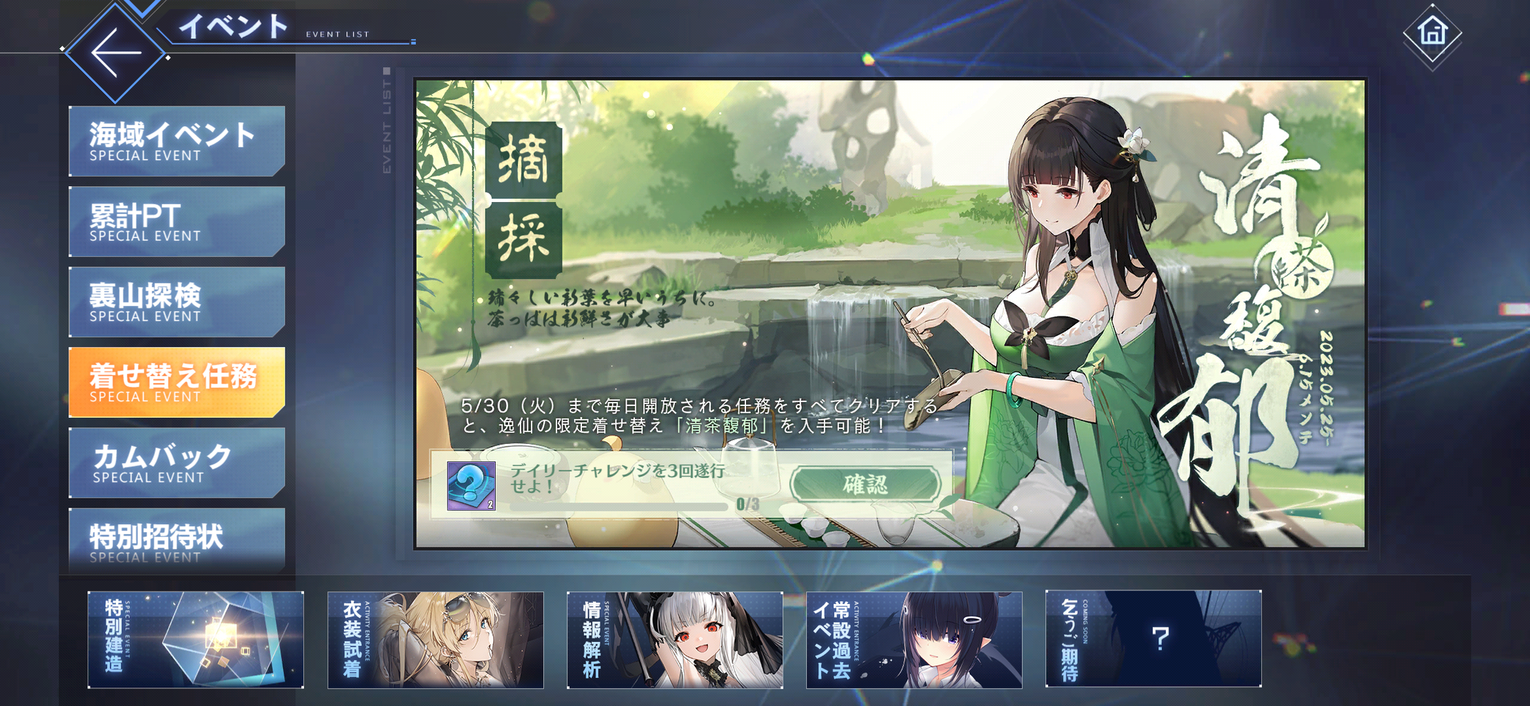 「逸仙」の着せ替えが貰える任務イベ(告知になぜか"復刻"って書かれてるけど、普通に新規かと)。