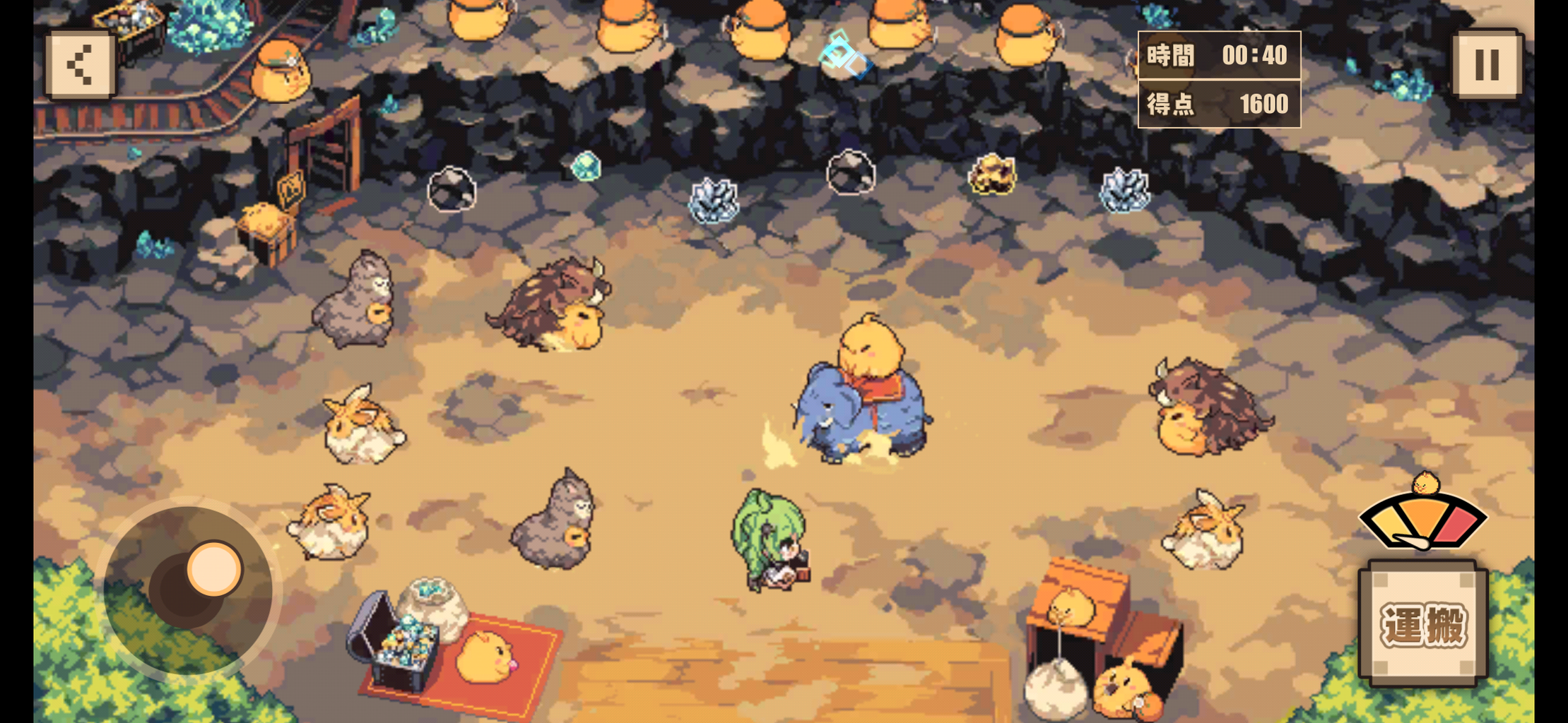新規ミニゲームは、明石を操作して画面上部で饅頭が掘った鉱石を、左右から出てくるお邪魔饅頭たちを躱しながら下まで運ぶというもの。お邪魔饅頭は種類によって速度が違い、早いやつが遅いやつを蹴散らしていく様子も。