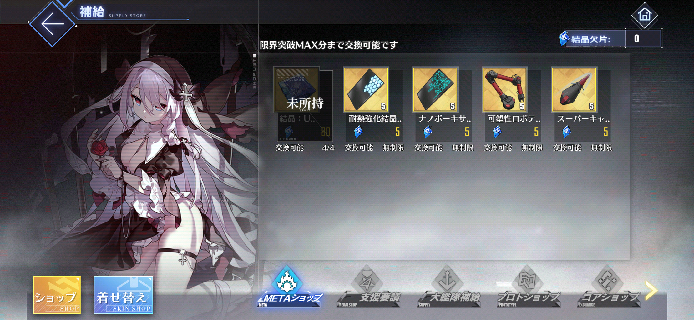 新たに「結晶欠片」と交換ショップが追加。追加された任務やセ作ショップ、アビータ戦、完凸分以上に手に入れたMETAで手に入り、一部METAの結晶やMETAの強化素材と交換ができる。他のショップと違い月や週での商品補充はなく(といっても強化素材は無制限だが)、今後のアップデートで追加されていく形になるとか。