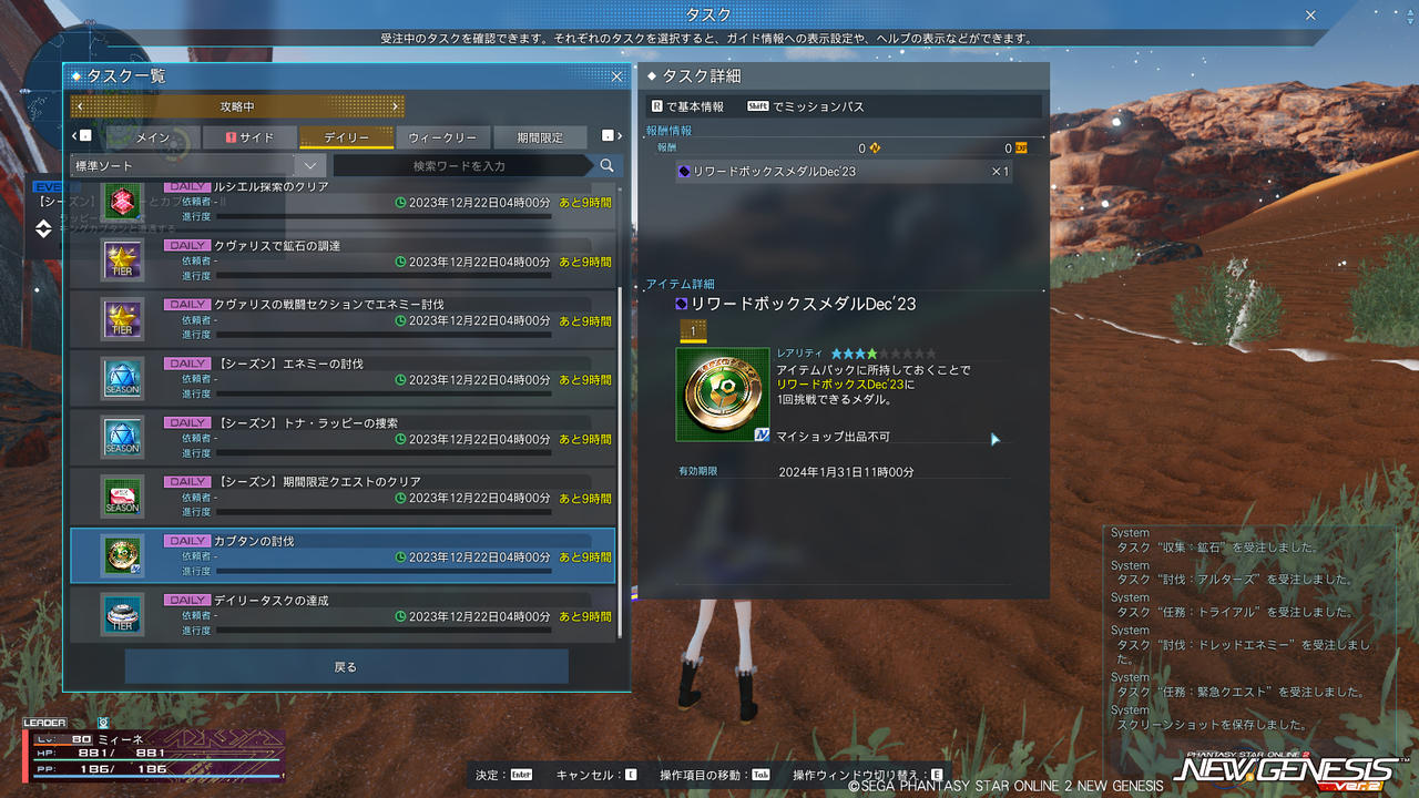 内容は変わるかもしれないけど、とりあえず今日の時点では「カプタンを倒す」でメダルを1枚貰える。1日1枚だと40個全部引き切るのは結構ギリギリになるね。今後タスク増えるのかしら。