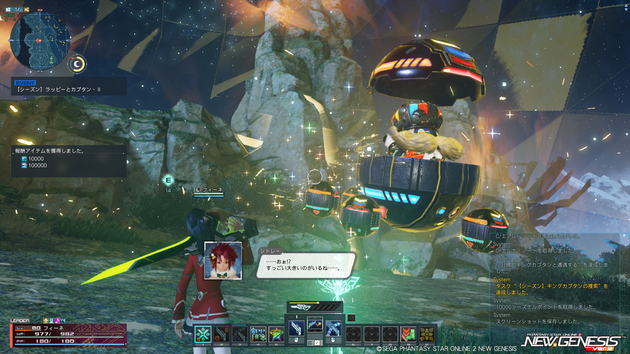 「謎の老人ベネファンが、アークスに感謝の気持ちを示すためイベントを用意!」という触れ込みのクエスト。いや謎の老人からプレゼント貰っても…