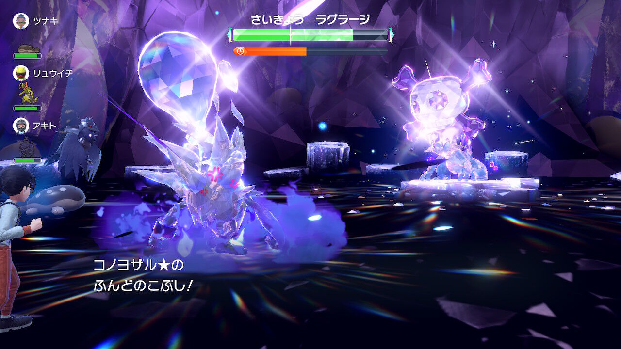 やることは簡単、「ビルドアップ」1回積んでおいて「ふんどのこぶし」を連打するだけ。バフリセットされたら「ビルドアップ」もう1回。気が向いた時に「きあいだめ」しておくとワンチャン急所でダメージ稼げるかもしれない。中盤1回倒された(倒されるのを見込んでテラスタルは温存した)のと、終盤「だくりゅう」「じしん」「ハイドロポンプ」の3連攻撃受けたのには焦ったが、時間こそかかれど脳みそ使わずに勝てるので楽。「ふんどのこぶし」が強すぎる。瀕死でリセットされないのも大きい。