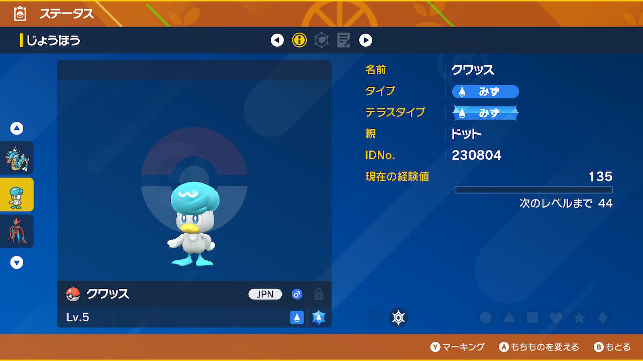 それはそうと、先々週にvsナンジャモで活躍したドットの「クワッス」が現在配布中。リコのニャオハ同様、Lv.5で初期技しか覚えてないのでアニメに合わせるなら自分で育成する必要がある。現時点では「はたく」「みずでっぽう」「けたぐり」「アクアブレイク」だったかな?「けたぐり」はわざマシン012、アクアブレイクはLv.35かわざマシン110で覚えられる。