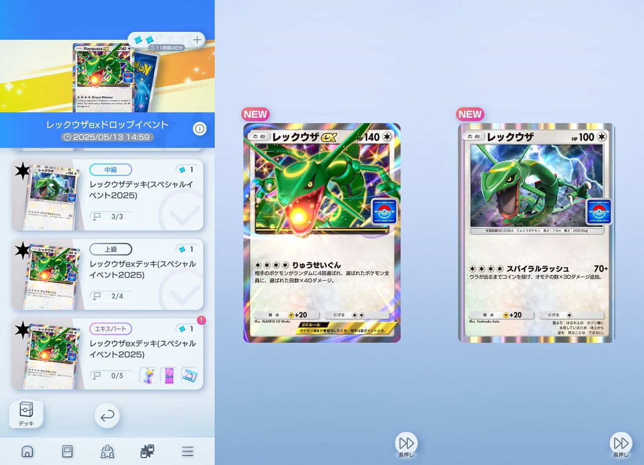 パック以外では「スペシャルミッション2025」が開催。ハーフアニバーサリー記念で、限定の周辺グッズや「レックウザex」などが貰える。砂時計などの消費アイテムも結構貰えるので、積極的に達成していきたいところ。