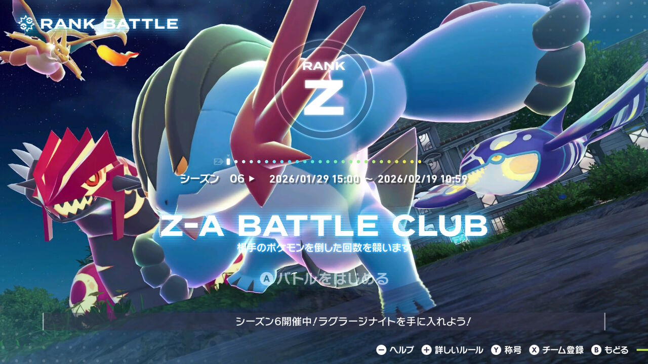 というわけで1/29から「シーズン6」が開催。今回はZAに登場する全ポケモンが参加可能。ただし禁伝はいずれか1体のみ。