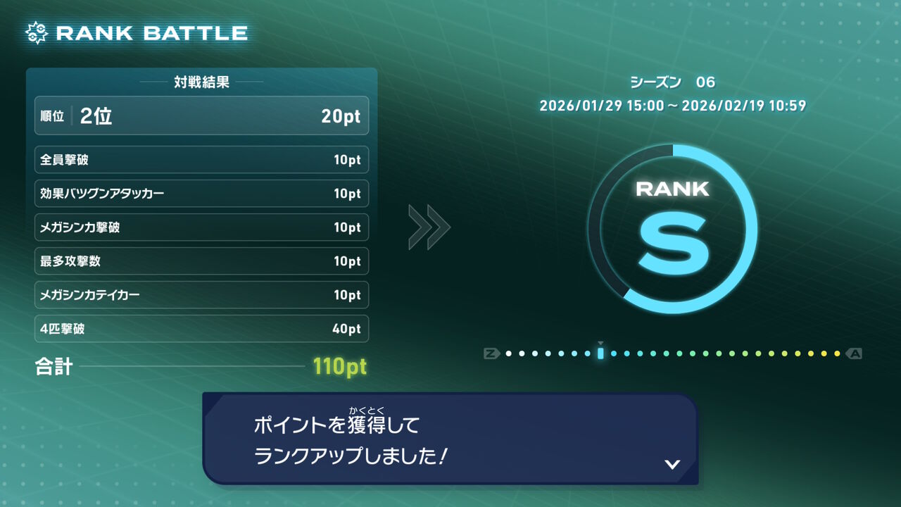 いつも通りランクSに到達して「ラグラージナイト」を入手したらさっさと撤退。なお今回も2戦で済んだけど、シーズン2でランクマ始めてから今回1戦目まではずっと1位だったが、画像にもある通り今回2戦目に初めて(同率)2位を取った。