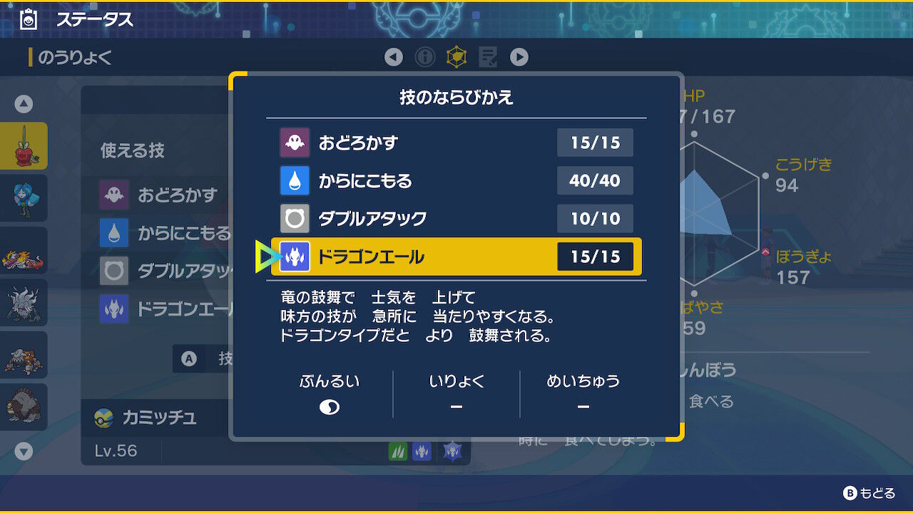 専用技は「きまぐレーザー」。威力80の特殊ドラゴン技。たまに他の首も協力してくれて、その時は専用メッセージと攻撃演出と共に威力が2倍になるらしい。要するに博打技。