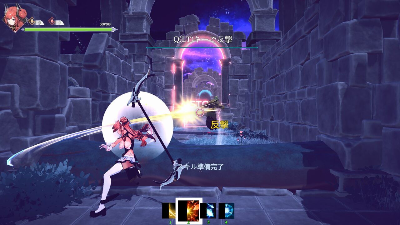 難点としては、体験版だからかまずキーコンフィグがない。正直やはり他のゲームに引っ張られてしまうところがあるので、特に回避がSpaceなのはやりづらい。反撃もQキーだけど、個人的には別のキーの方がやりやすいなぁ。