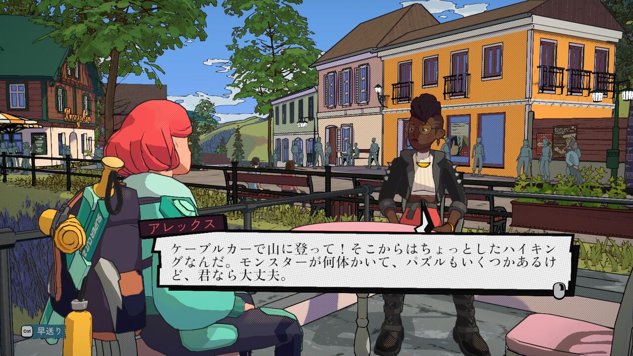 朝、ホテル前のテーブルで昨日のことについてルイーザが考えていると、体験版でも登場した「アレックス」が登場。昨日命の危機にいきなり瀕したことで気持ちが落ち込んでいたが、彼女の勧めでせめて「魔法」を使うまでは頑張ってみようということになる。
