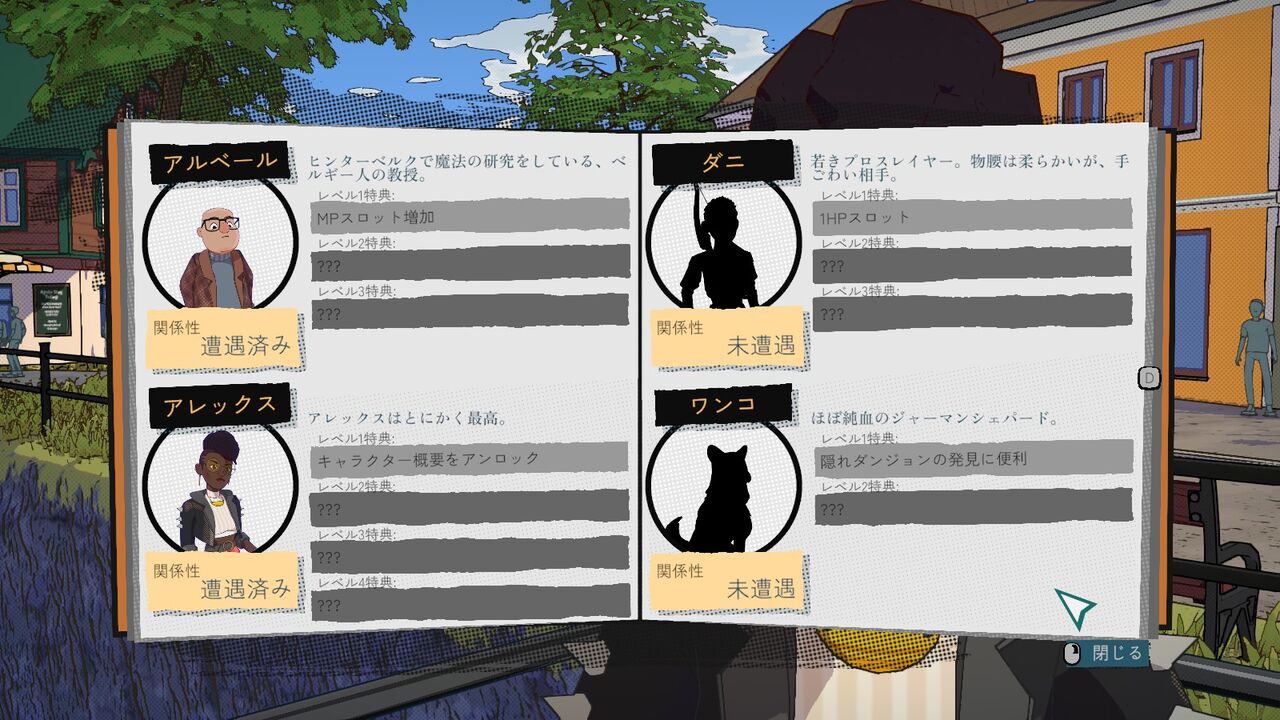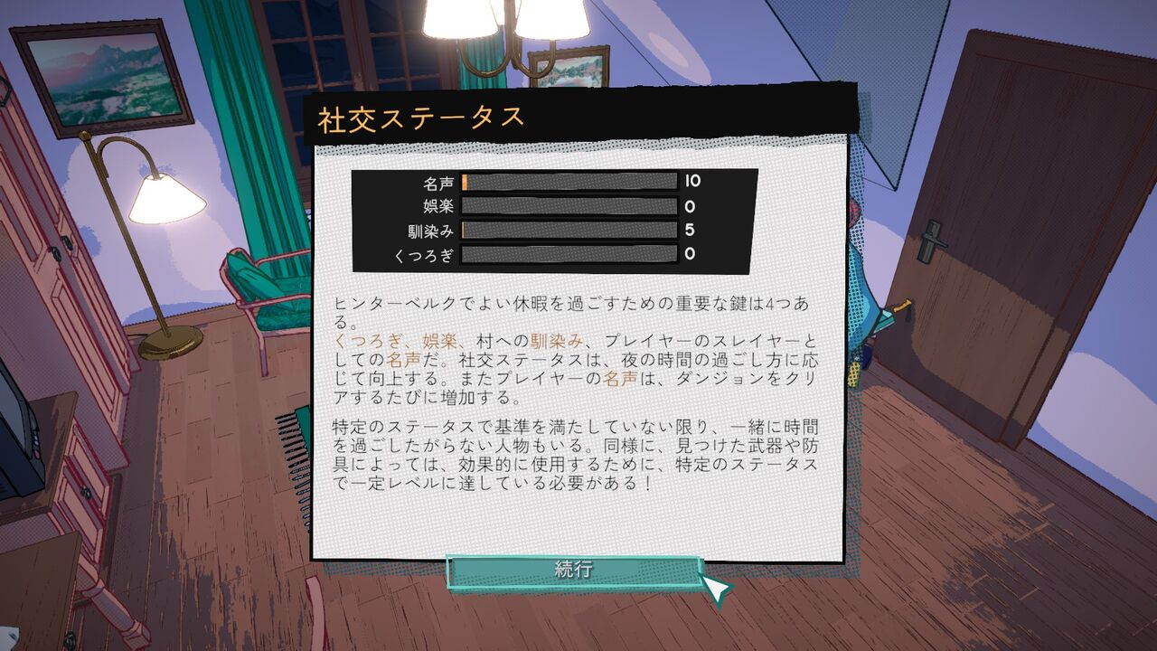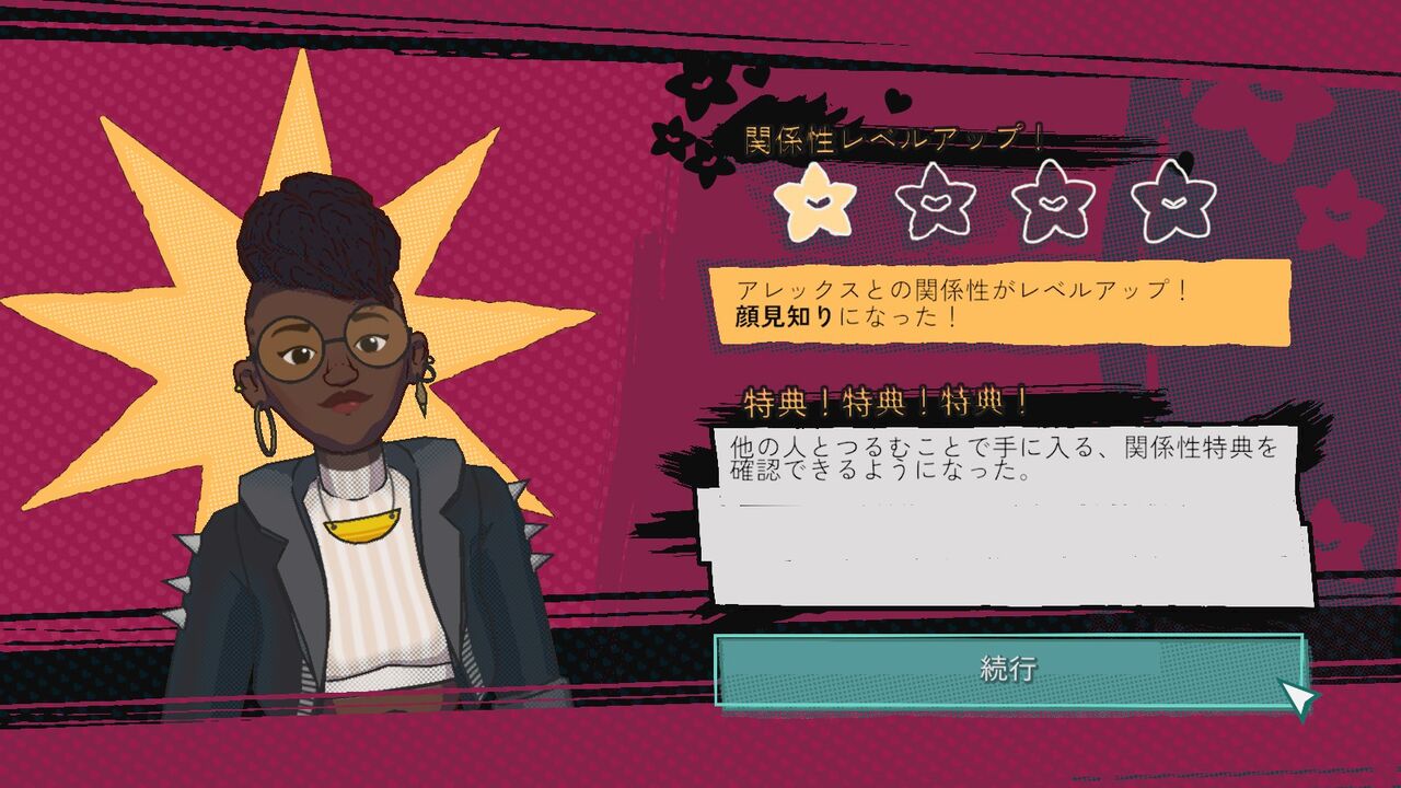 ダンジョンから帰還して夜。アレックスから現地の人たちと交流するのを勧められる。夜に交流したりお店で買ったプレゼントを上げたりすることで「関係性」が上がっていき、キャラ毎に様々な特典を得られる。「特典!特典!特典!」は結局そのままなのね。