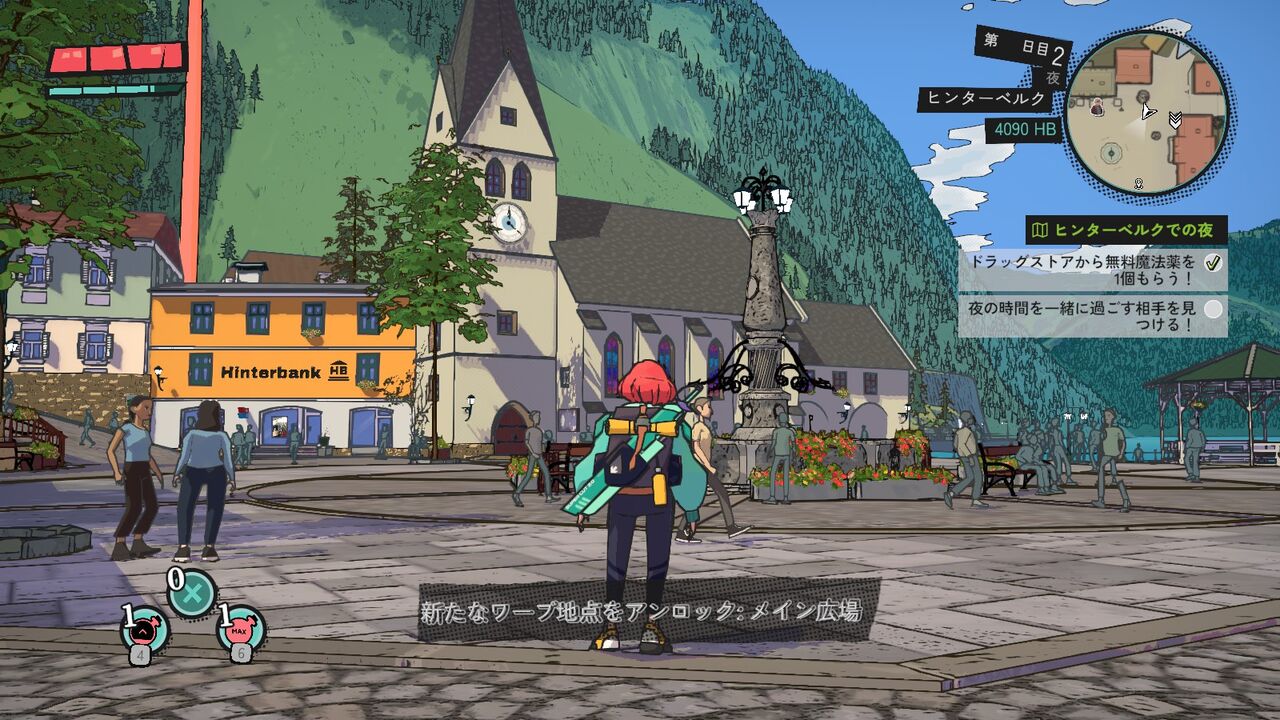 その前にヒンターベルクの街を探検。街での自由探索はこの夜時間のみなので、交流する前にお店で装備や回復アイテムを買うのを忘れないように。アレックスが教えてくれるがドラッグストアで無料の回復薬を1個貰える。