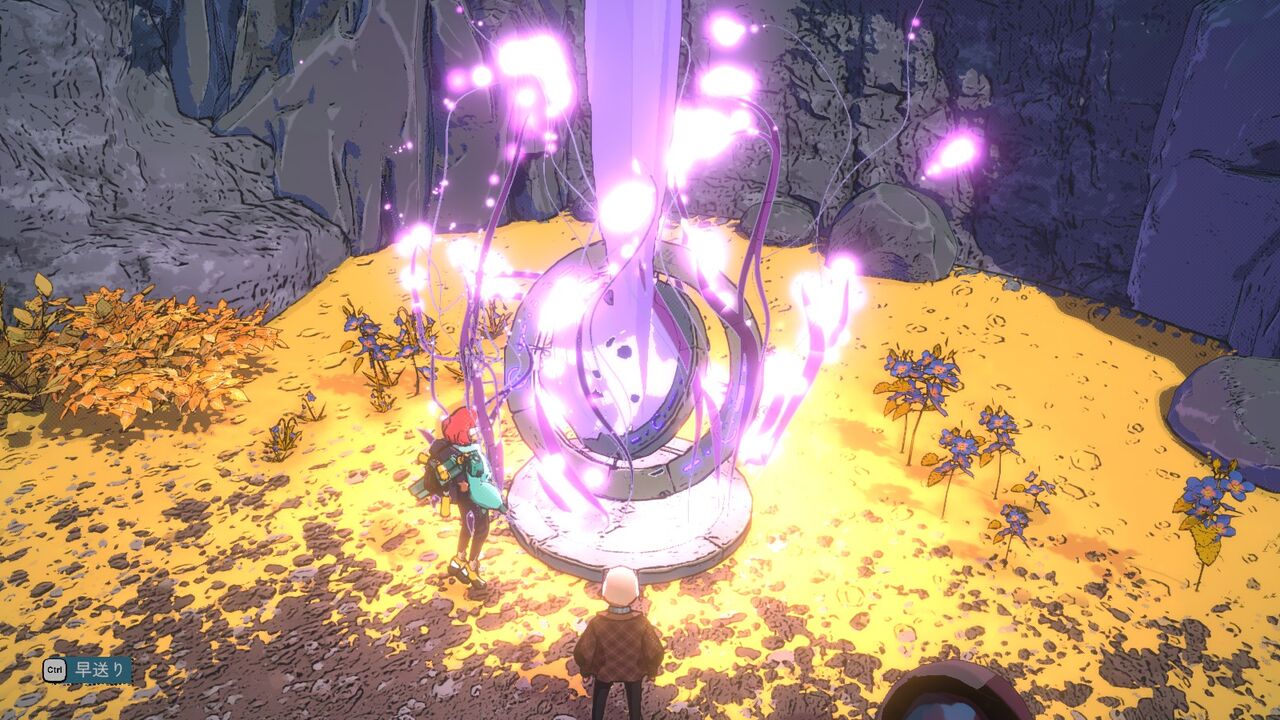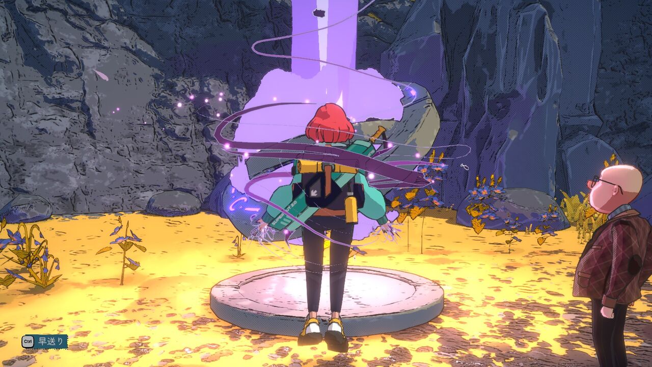 その後少し進んで、「スキルの祠」でなんか怪しい呪文を唱えているおじさんこと「アルベール」と出会う。彼も体験版でも登場して、その時も場所は違うが同じような会話してたかな?彼は冒険者ではなく、あくまで魔法の研究をしているだけの様子。