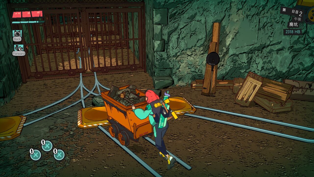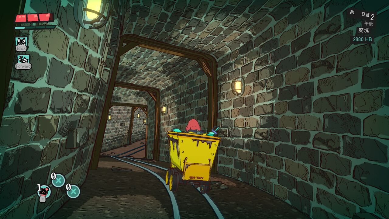 奥へ進むと、乗り込むと自動で進むトロッコが登場。左右に傾けることで線路の分岐を進むことができる。乗ってる間は敵が出たりだとか障害物をジャンプで飛び越えたりだとかそういうことはないので安心だが、結構行ったり来たりする必要があるうえ途中で降りれないので、ギミックの状態を間違えるとちょっとめんどくさい。