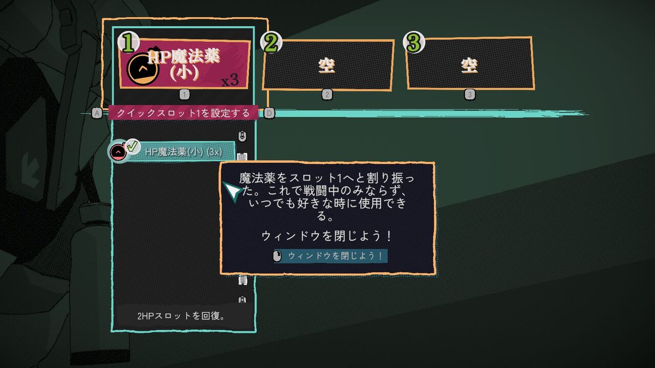 そこの担当である「マリーナ」から、初心者ということで回復アイテムを貰える。スロットにセットすることで即使用可能で、同じ種類は何個でもセットできる。要するに3種類までセットしておけるということ。逆に言うと、似た効果でも違う名前の場合は別のスロットになってしまう。