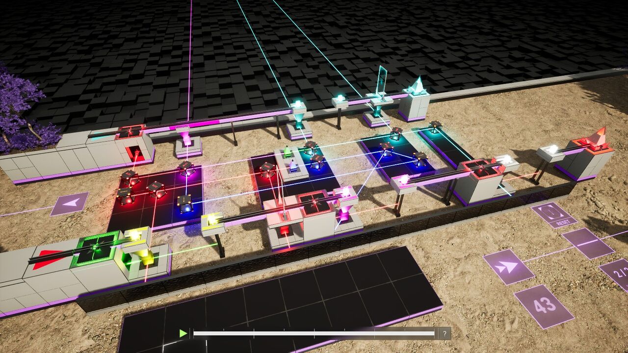 周囲の雰囲気が変わって31ステージ目。ここからは過去作でもお馴染みの分光板が登場。板の色と同じ色のレーザーは素通りさせて、それ以外の色は90度曲げる。この時レーザーが複合色の場合、板の色とそれ以外で分光する。文章で分かりづらかったら上の画像見てください。
