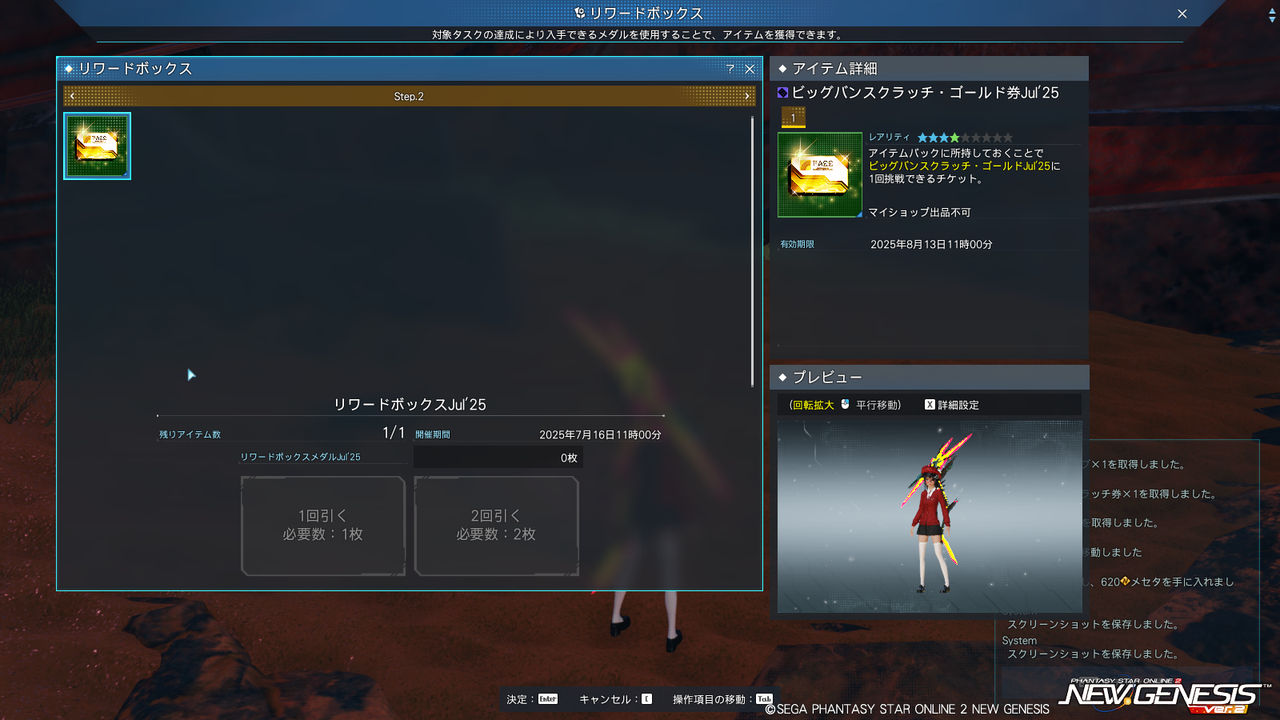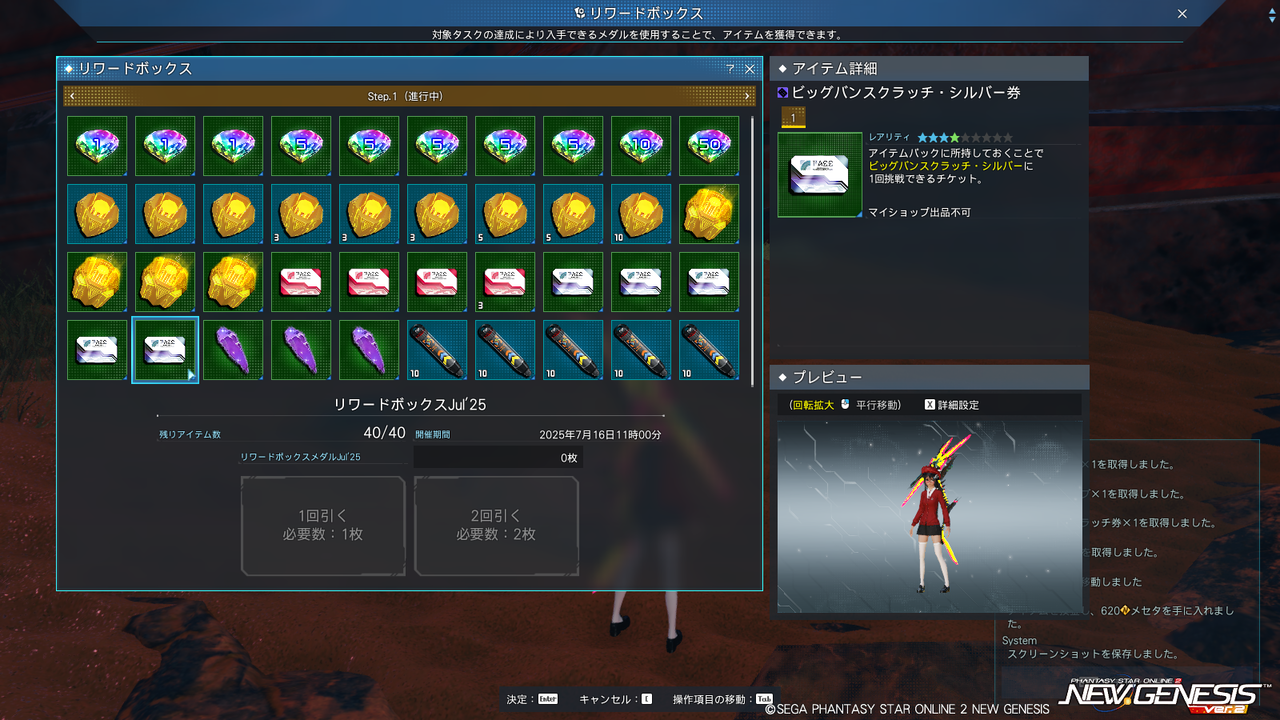 いつものやつ。今回もSGとか換金アイテムとか。Step.1の40個を全部引き切るとStep.2に先述のビッグバンスクラッチ・ゴールド券が1枚貰える。