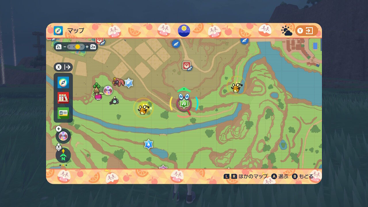 続いて「モルペコ」。画像(上)だと夜になっちゃって分かりづらいが、中央の色が灰色気味になる。ちなみにはらぺこの時も、中央の色が紫から紺色になっている。