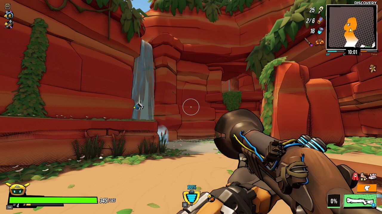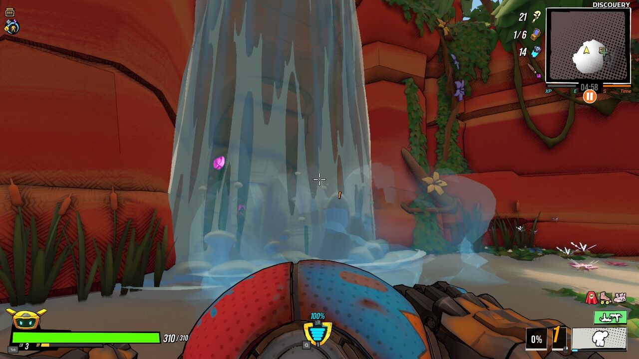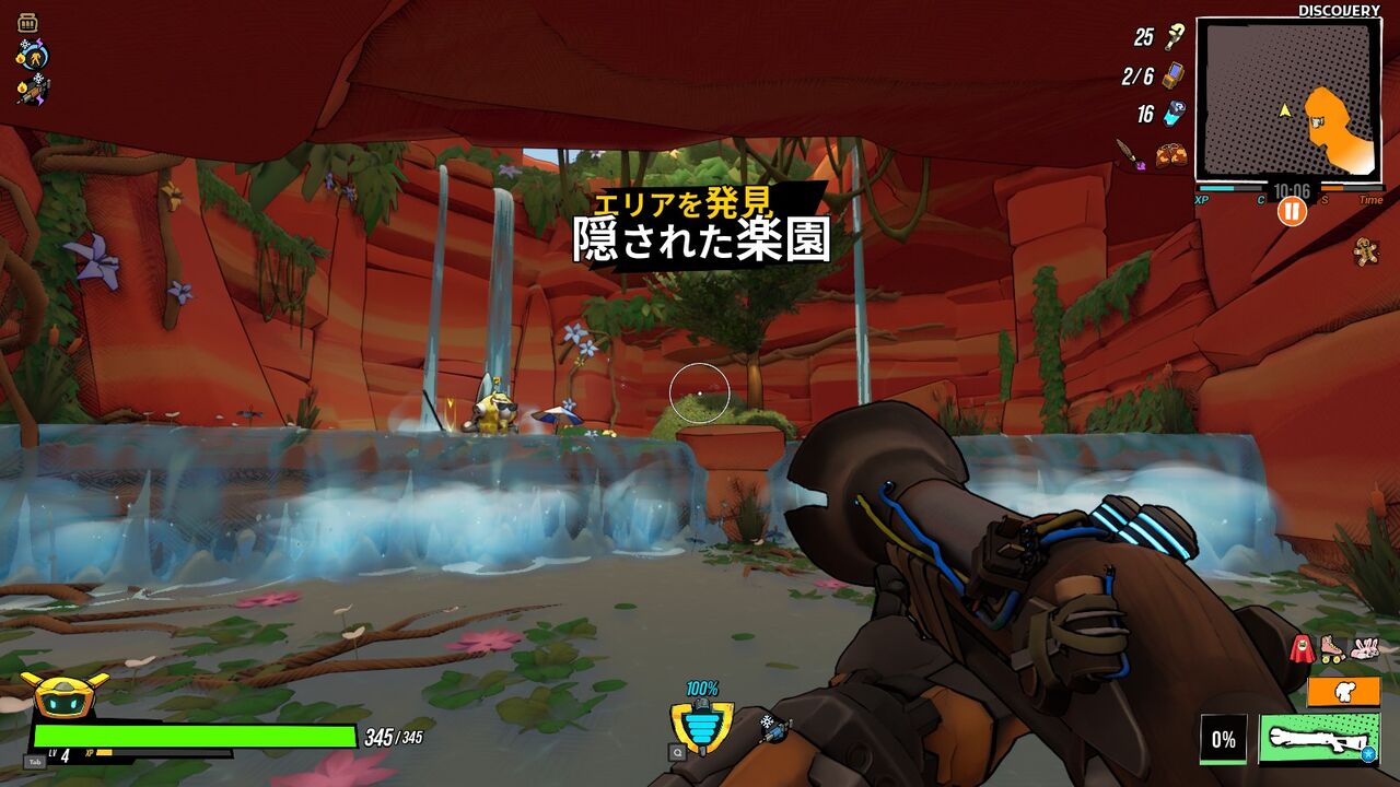 続いて「OASIS」ステージ。開始地点に流れる滝の裏に扉があって、そこに先ほどの「BuddyBot」を持っていくと扉が開き「秘密基地」へと入れる。