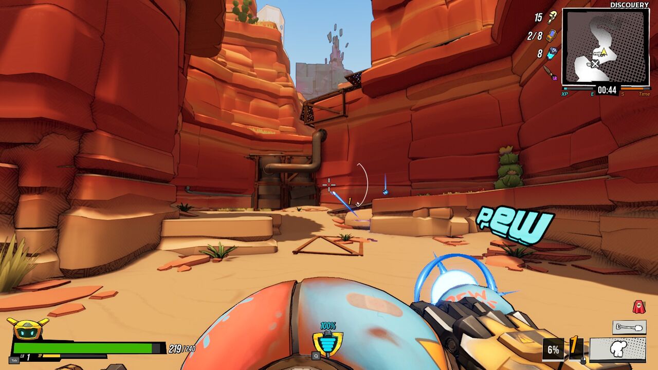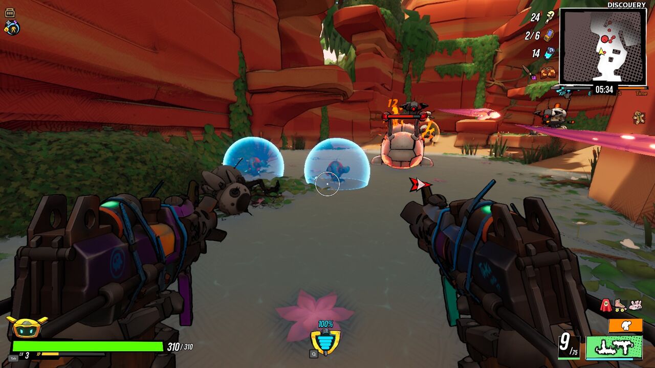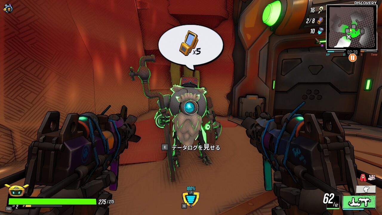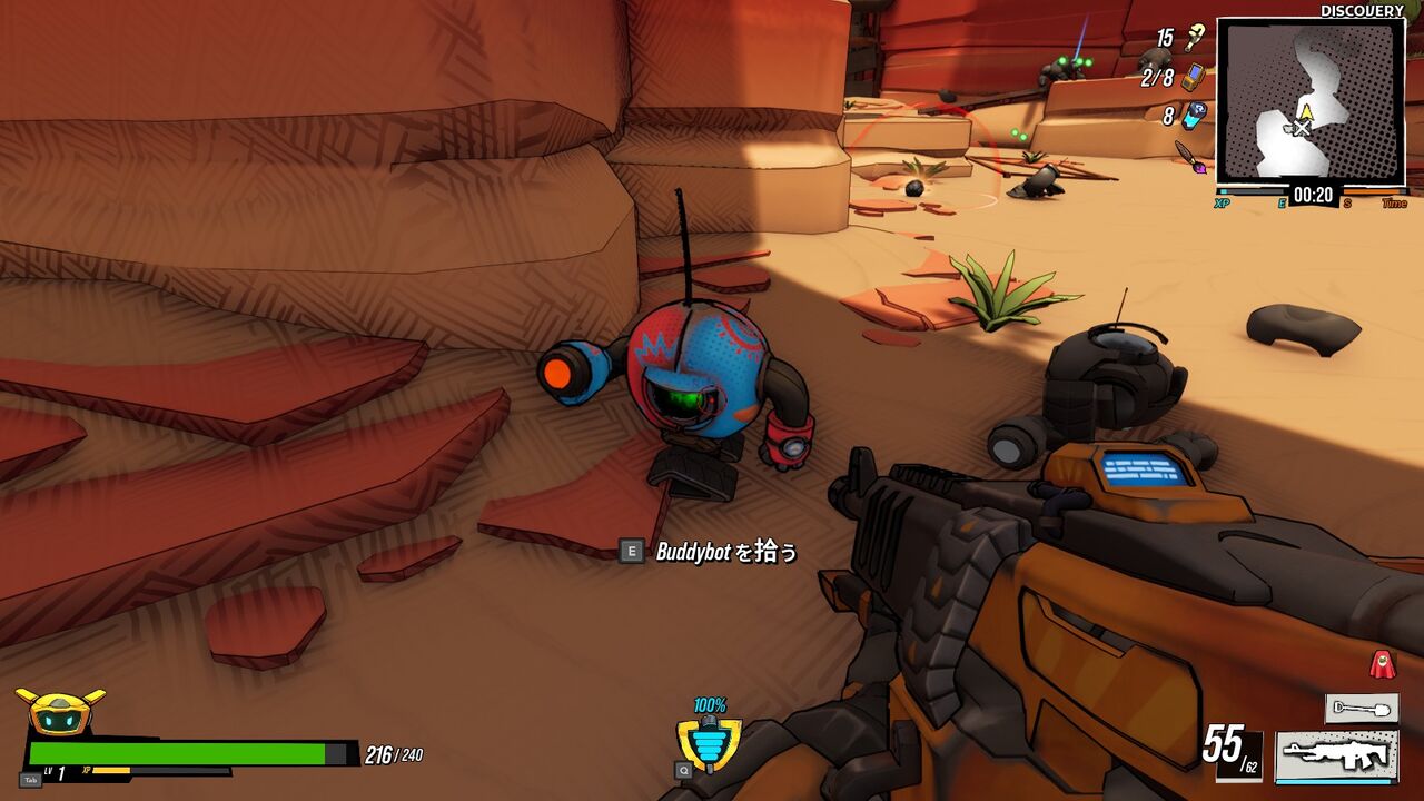まずは「CAYNONS」。ランダムで出現する赤と青の小さいロボット「BuddyBot」。実は敵ではなく味方だったらしく、近づいても攻撃してこないし、Eキーを押すと武器として取得できるという。今まで全く気付かずに瞬殺してたわ…ごめんね…