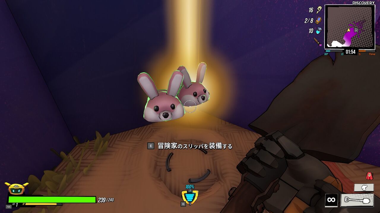 少し進んで侵食エリアの近く、盛り上がっているところをショベルで掘り返すとガジェット「冒険家のスリッパ」をゲット。効果は酸のプールに落ちた時のダメージを35%カット。不意の落下はもちろんのこと、侵食エリアでちょっと難易度の高いアクションステージで落ちまくる時にダメージを減らせるのはありがたい。一部ボスのせり上がってくるやつも万が一の保険になるかも。