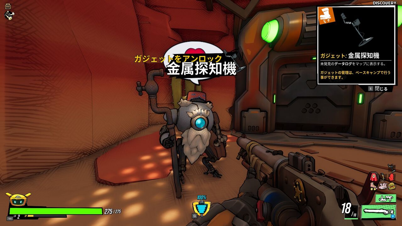 まずは最初のステージ「CANYONS」。中間休憩ポイントにいるデータログを要求してくる老人ロボに、今回は35個以上入手して話しかけることでガジェット「金属探知機」をゲット。なんとまだ見つけていないデータログの位置をマップに表示してくれるという非常に優れもの。めっちゃありがたい。