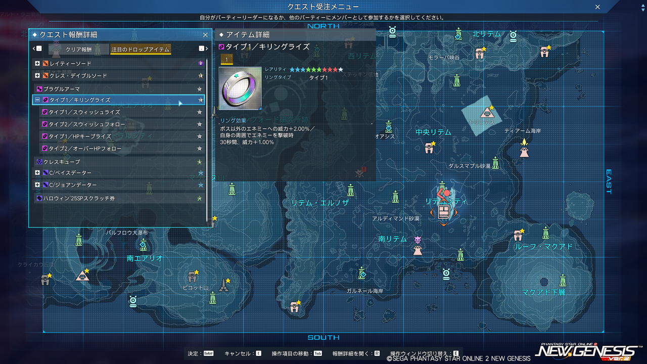 今回実装されたのは5種類(+配布1種)。それぞれ名前の先頭に「タイプ1/2」と付いていて、タイプ1は火力面(ボス/雑魚への威力アップや条件を満たすと威力アップなど)、タイプ2は防御や効率面(条件を満たすとHPやPPの回復、PP消費減、ダメージ耐性など)を強化する効果といった形になっている。現時点では各タイプから1つずつ装備できる(なお装備変更はアークス拠点でのみ可)。