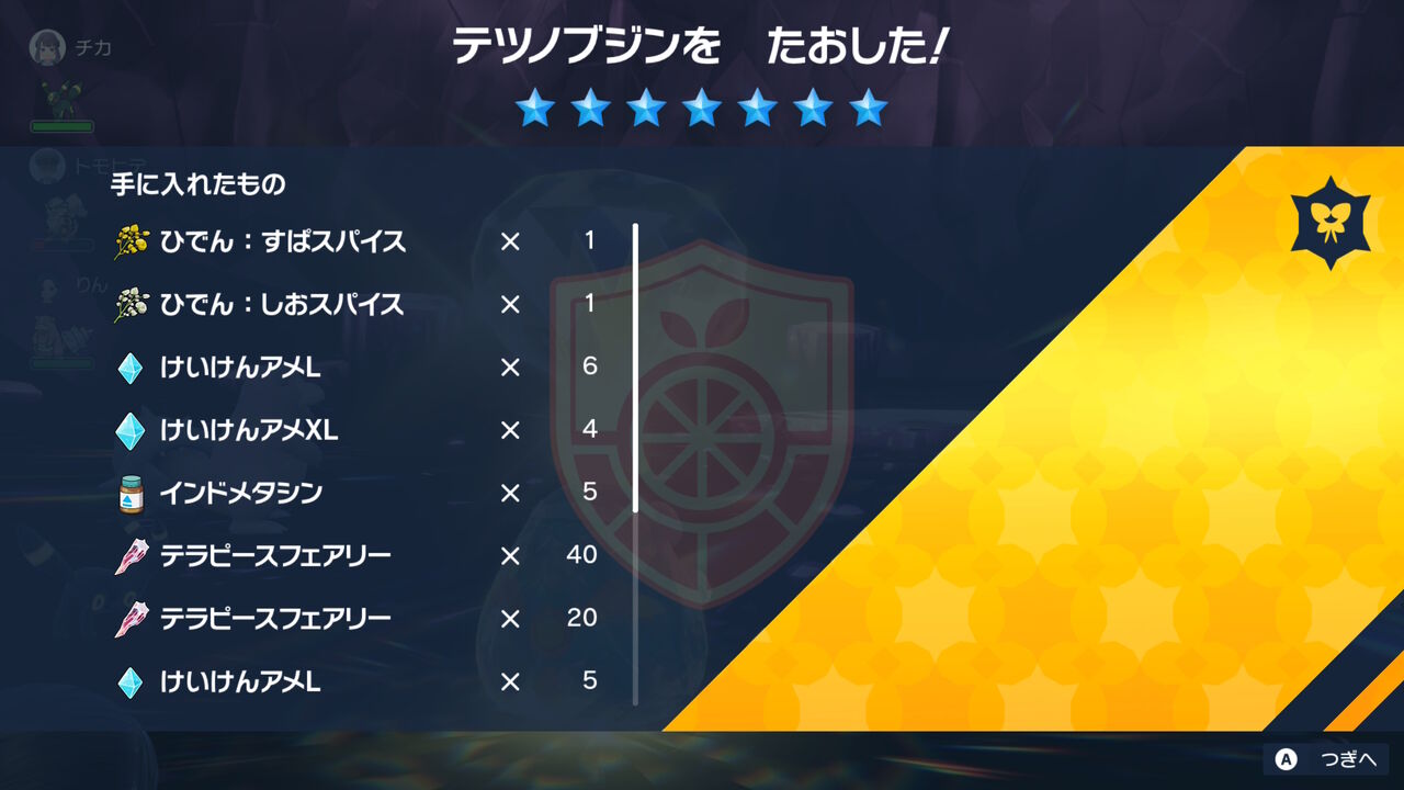 というわけで最強パラドックスポケモンでした。報酬はいつも通り。どっちにしてもソロだと倒すのに手間かかるから、スパイス集めに使うのはちょっと億劫かな。