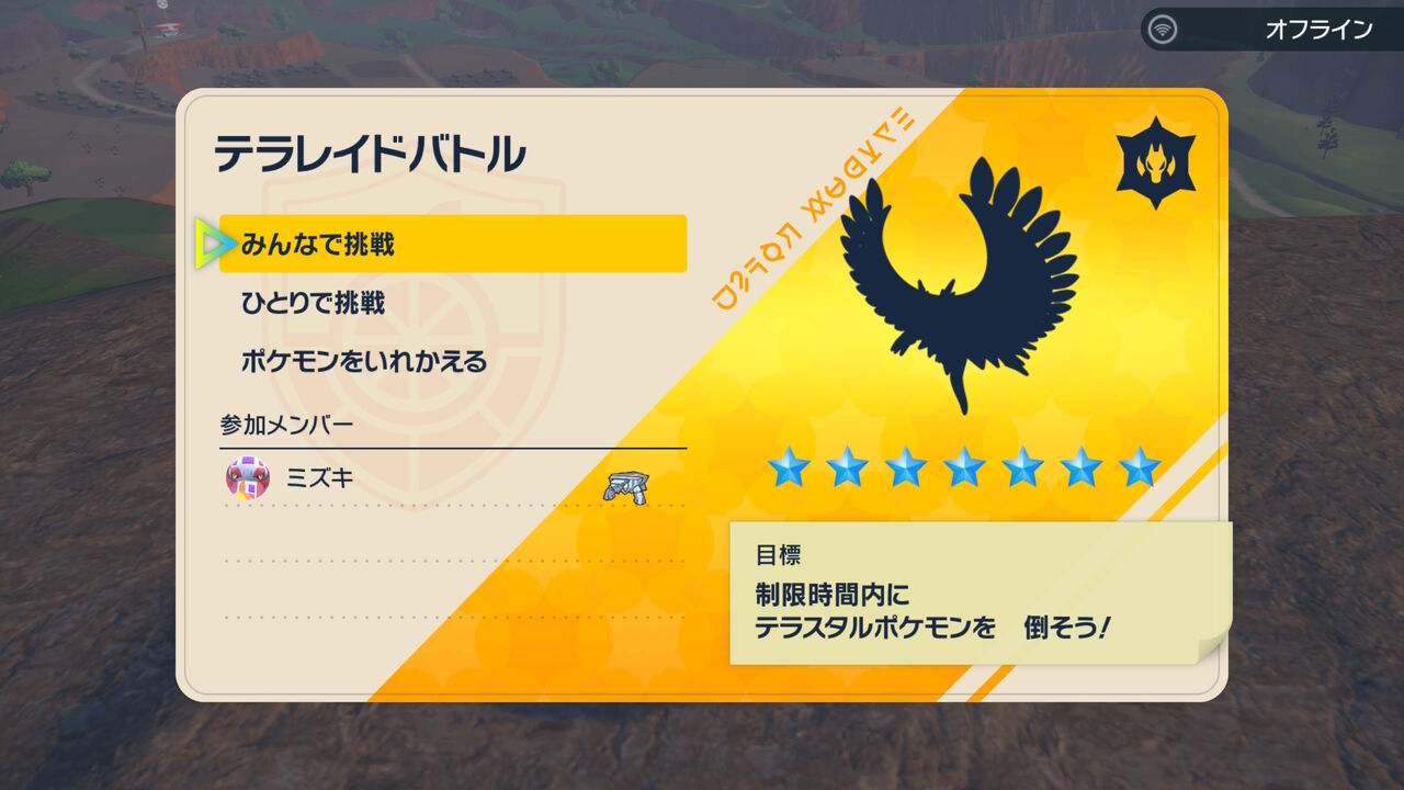 私はスカーレットなので、例によって弟のバイオレットを借りての参加。なおオンラインだと別バージョンのレイドに参加できない不具合が起きてるらしい。