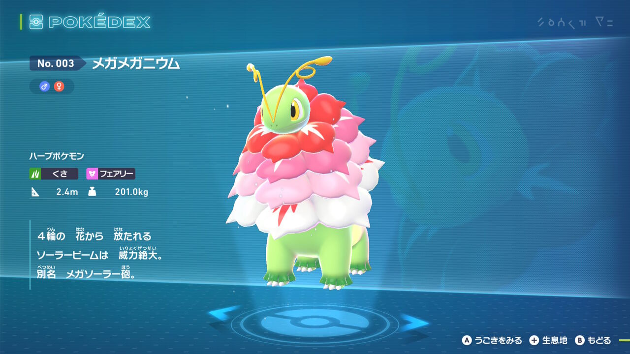 というわけで、待望の「メガメガニウム」!メガが被るからないだろうと思いつつも、御三家には流石にメガシンカ入れるだろうという予想を信じてチコリータを選んだけど、本当にメガメガニウムになるとは思わなかった。多分今作でこのAZからメガストーン貰った時が一番声出して喜んだまである。