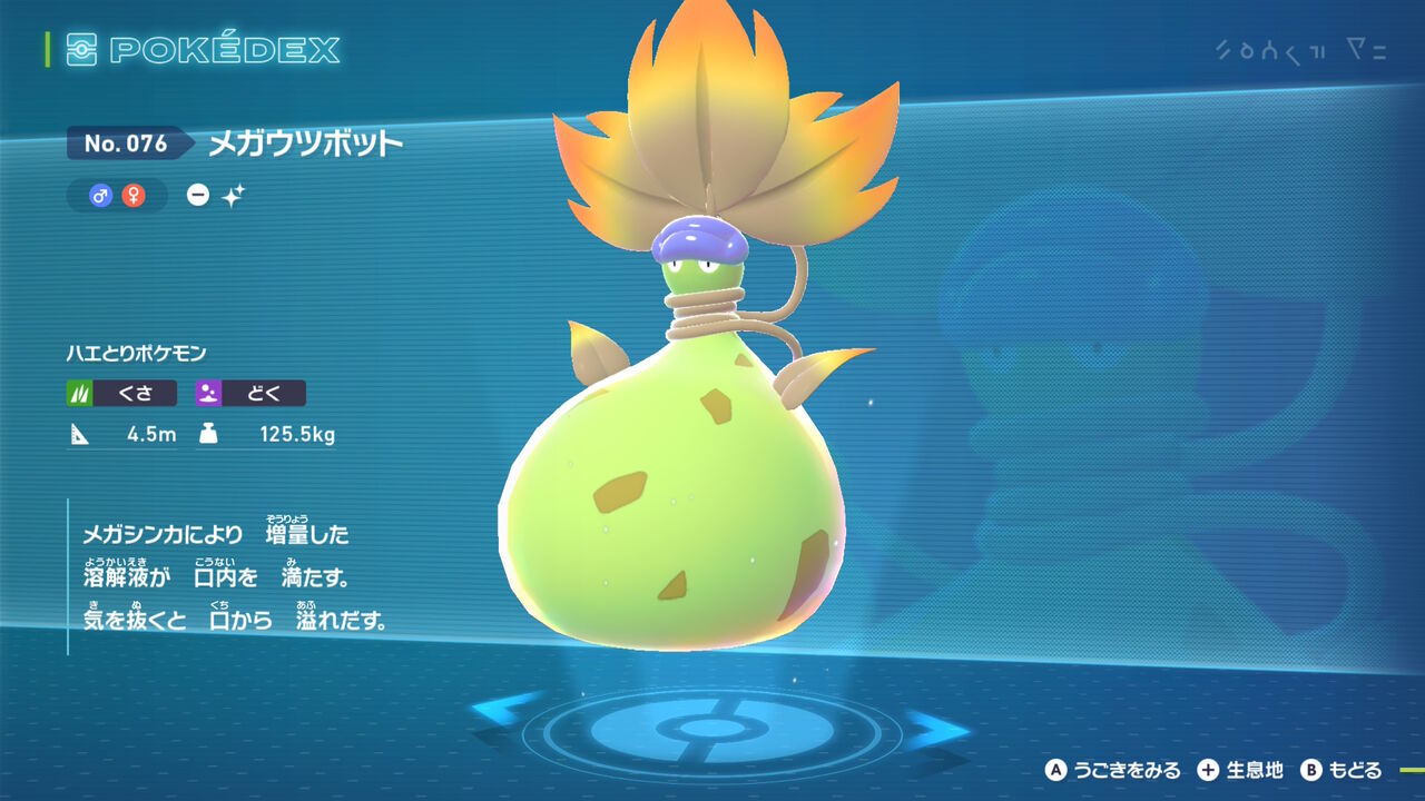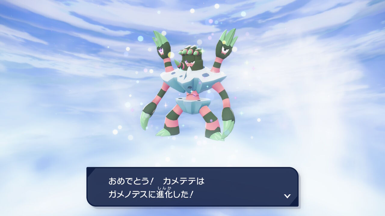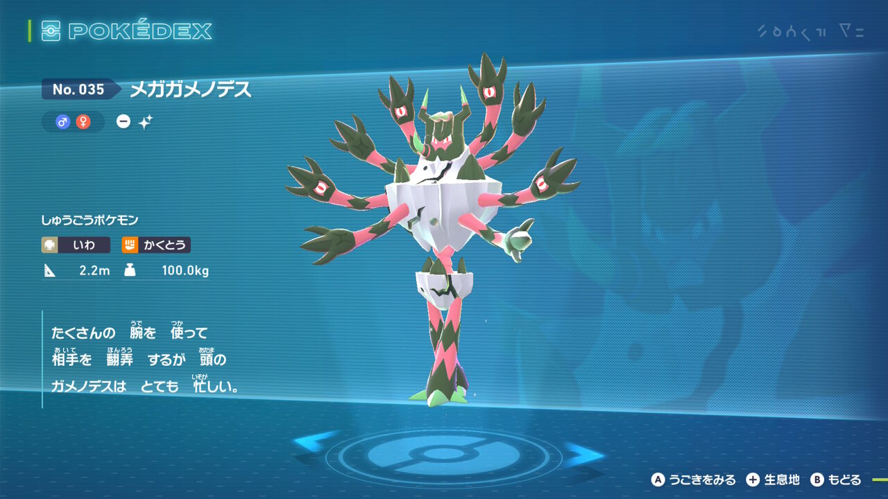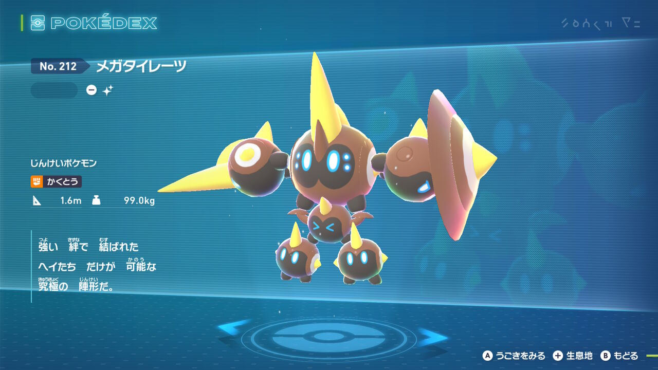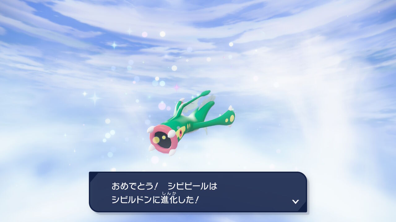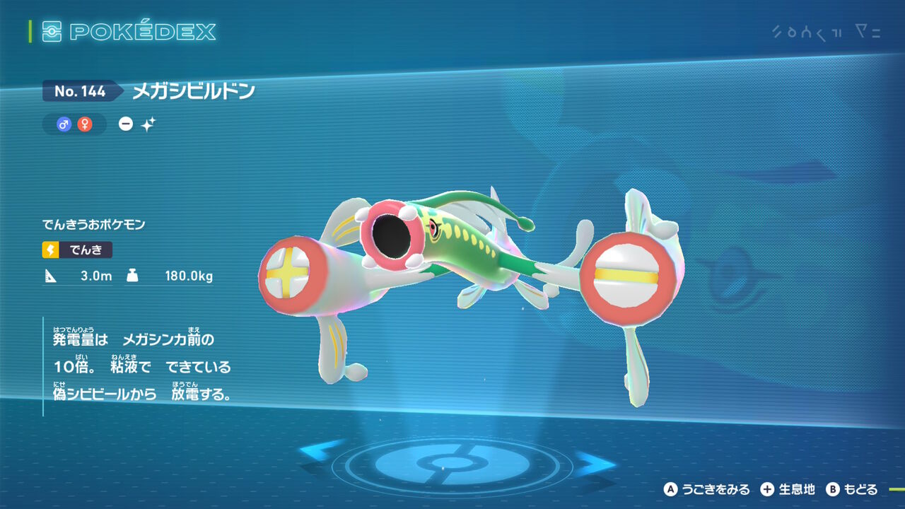 続いて「シビルドン」。本体は鮮やかな緑色になった。メガシンカもそのまま、腕のシビビールもどきは変わらずかな。それより進化前であるシビシラスの色違いが分かりづら過ぎて、今作の色違いが湧いたら分かりやすいのは非常にありがたかった。