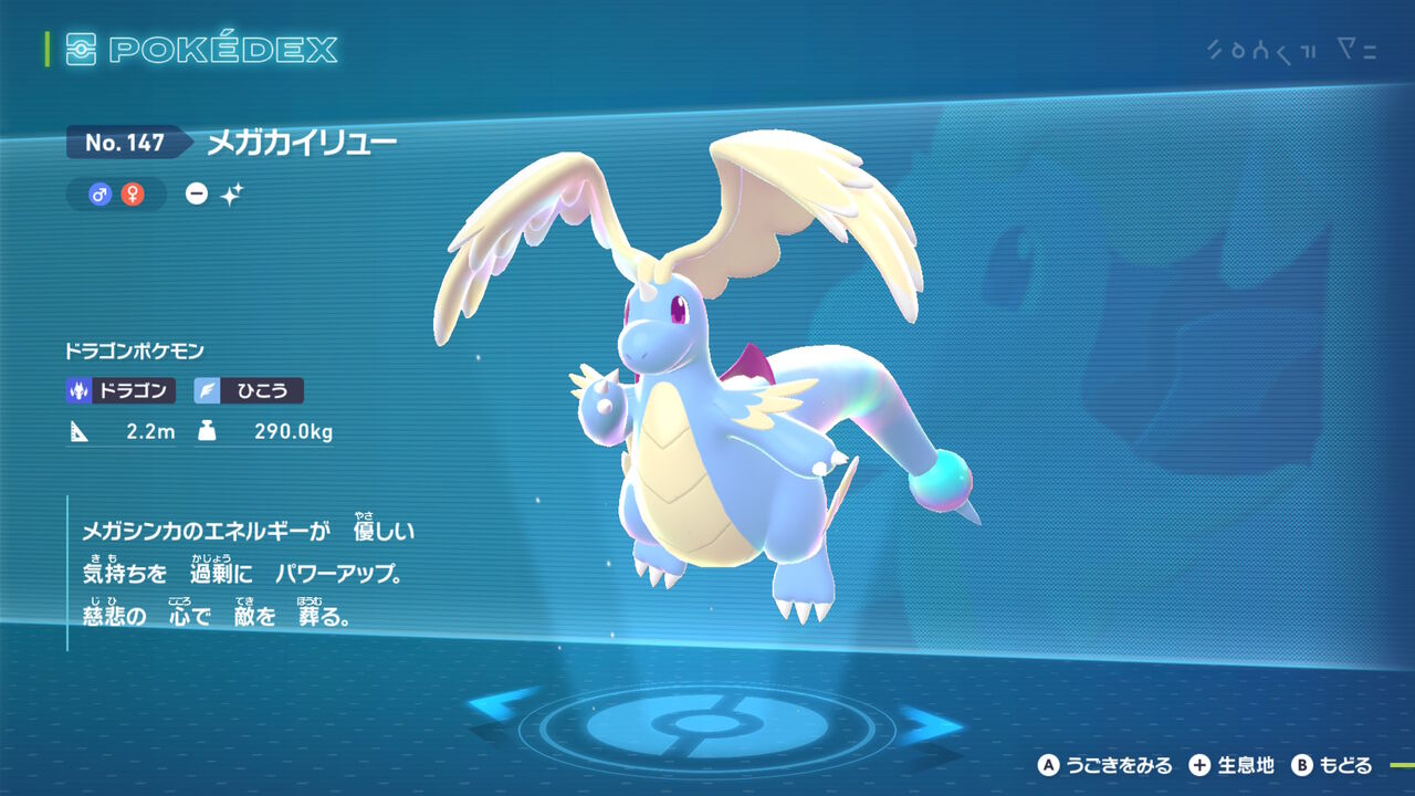 今回最後は「カイリュー」。色違いが緑で賛否あってメガシンカがどうなるかと思ったら、なんとまさかの青色に。メガシンカによって羽根や宝玉といったハクリュー要素が戻ってきていたが、まさか色まで戻るとは思わんかった。