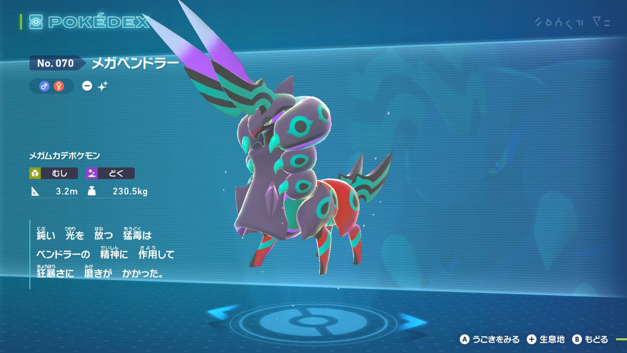 お次は「ペンドラー」。模様の部分が青緑になり、メガシンカもそのままの色合い。身にまとった鎧は色違いホイーガを踏襲してる感じ。