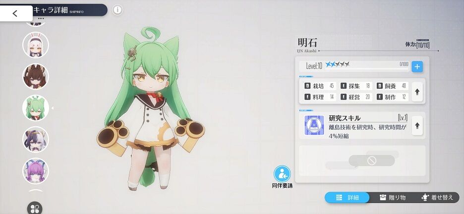 これでようやく「明石」をこき使える配置できるようになった。スキルは研究時間の短縮。入手するころにはある程度済んでいること、最終的に腐ることを考えると、入手の手間の割に微妙なスキルなのがちょっと残念。