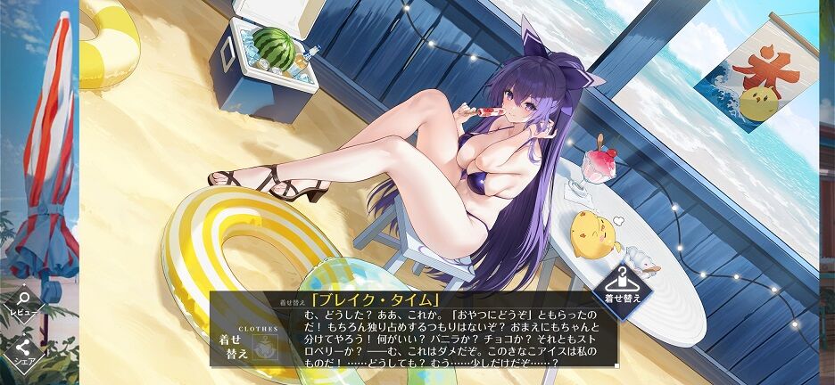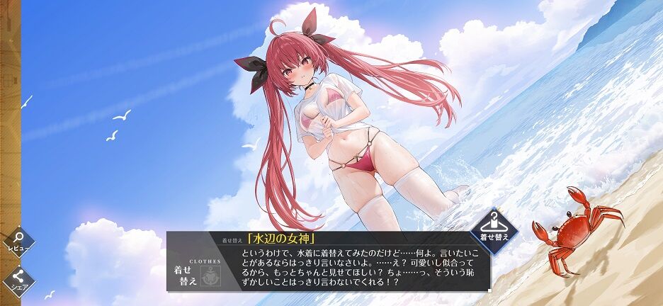 流石にコラボということもあって、水着としては比較的まともで普通に可愛い。まぁ胸とか太腿とかは盛られてそうではあるし、水着ニーソとかいうフェチなのもあるが。今月は原作知らないコラボだから節約できるな~とか思ってたのに、気付いたら6着全部買ってしまっていた。