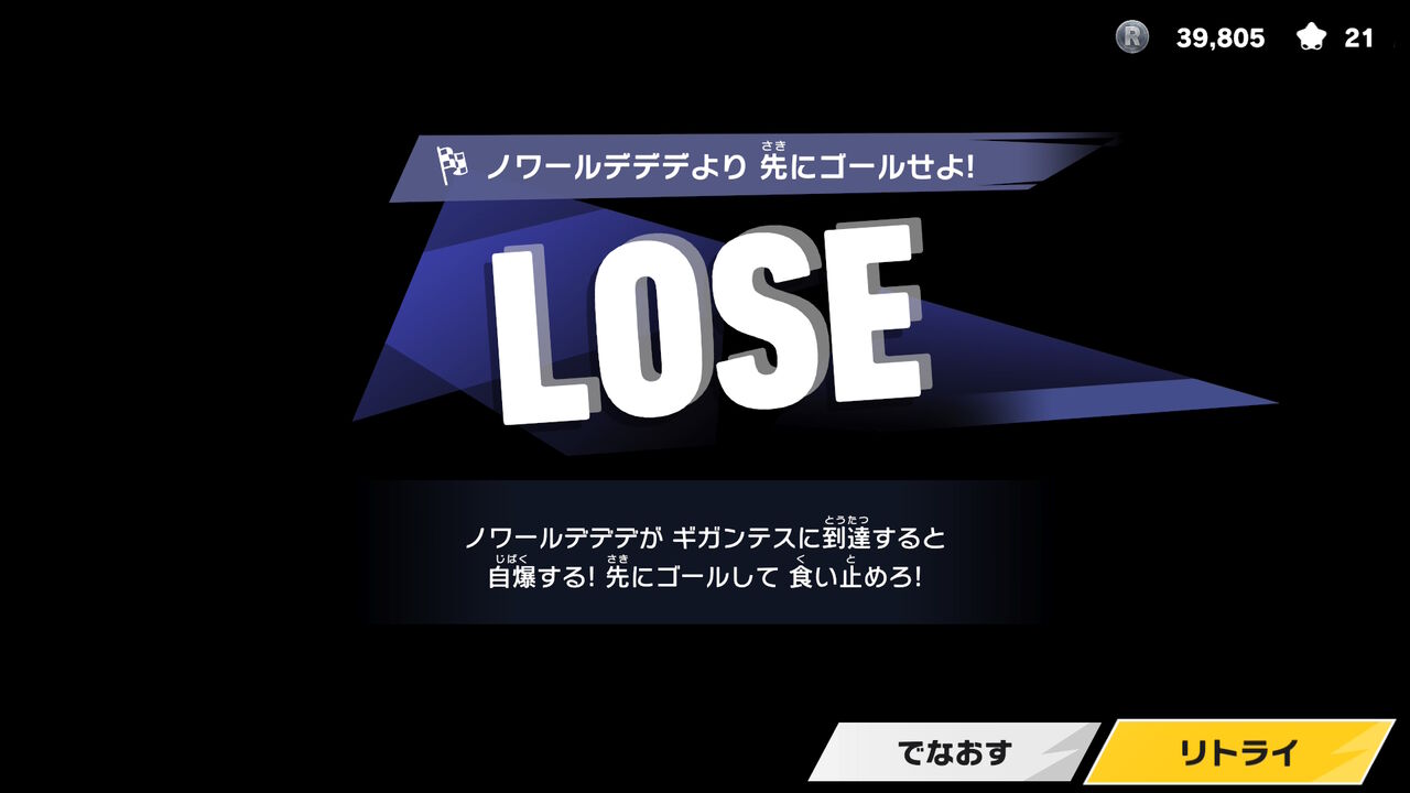 ついでなので最後のノワールデデデとのレースで負けてみた(というかマシン選択ミスって普通に負けた)。