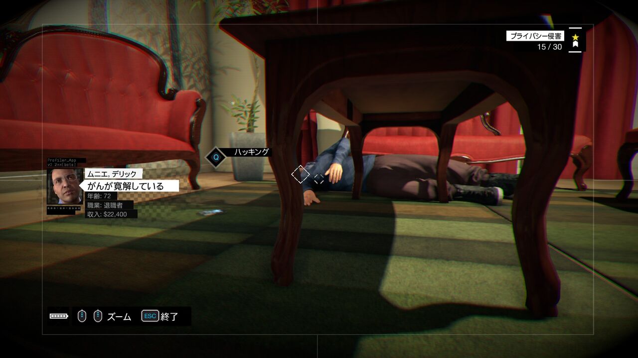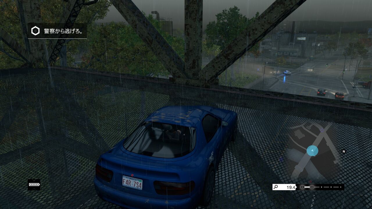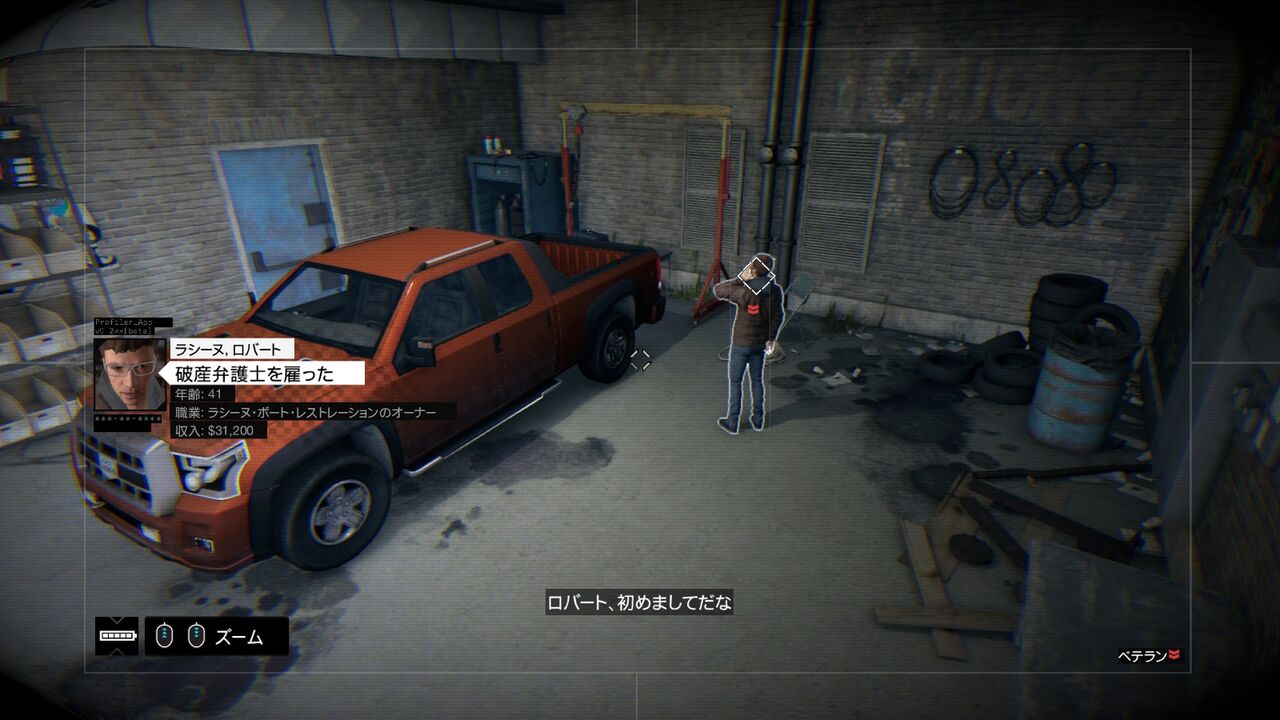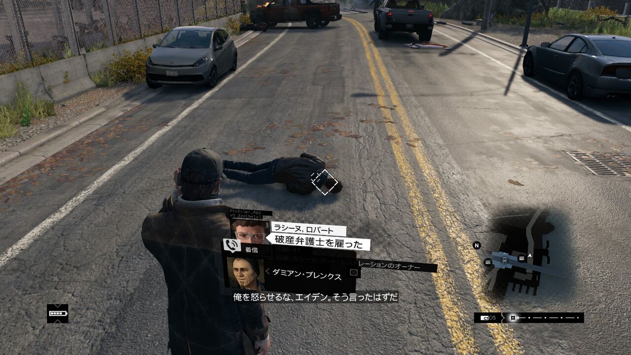 オフィスにアクセスすると、ラシーヌが逃げ出すので追ってテイクダウンさせればクリア。このゲームドライブバイ出来ないから、車で逃げられると止めるの結構大変なのよね。だからハッキングスキルは優先して取っておくべしなのよ。