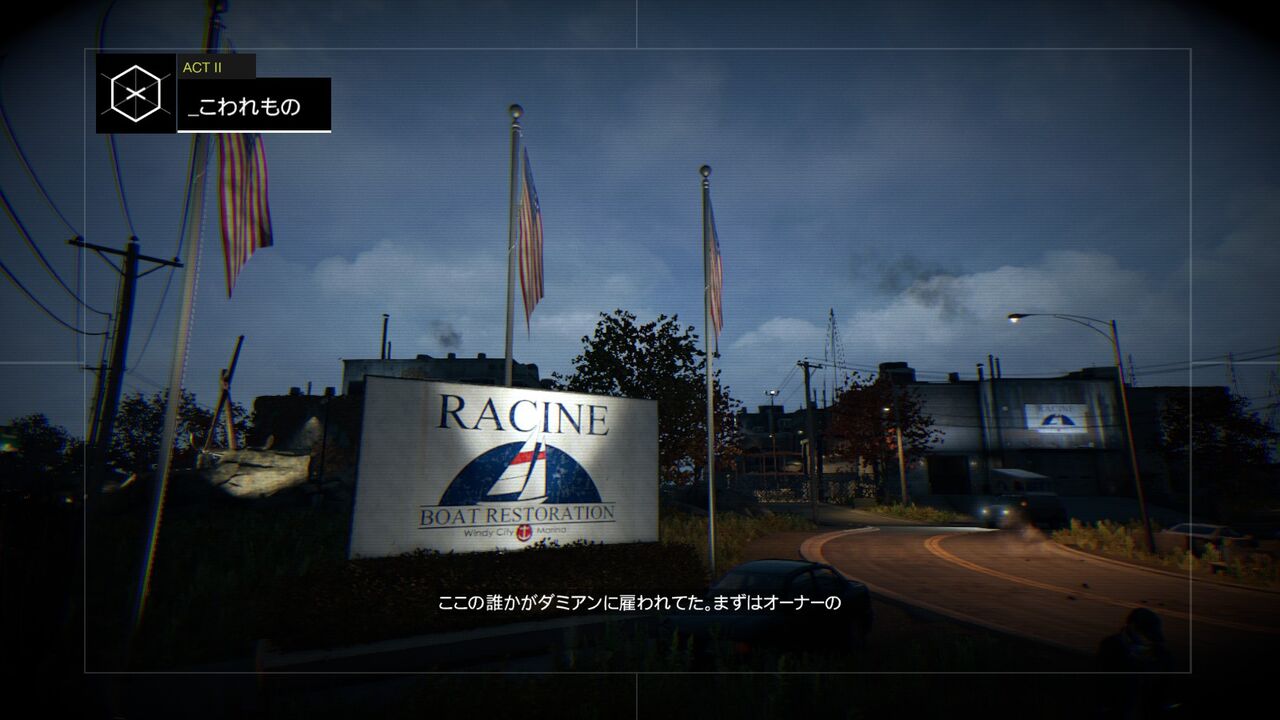 フィクサーを排除した後、電車を追ってジャクソンと再会。喋れないゆえ彼が何を思っていたかはわからないが、エイデンは説得してジャクソンが聞いた情報を得て、ひとまず彼を信頼できる人に預けることに。次は手がかりを元に「ラシーヌ」を探す。