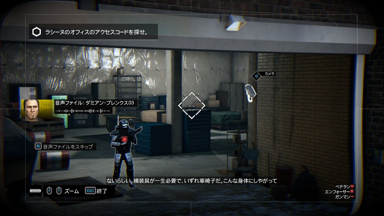 ダミアンに雇われていた「ロバート・ラシーヌ」を探して、オフィスへ向かうことになる。もちろん警備は厳重だが、爆破ギミックがところどころにあるので、先にカメラを使って位置把握がてらある程度人数減らせるのはありがたい。