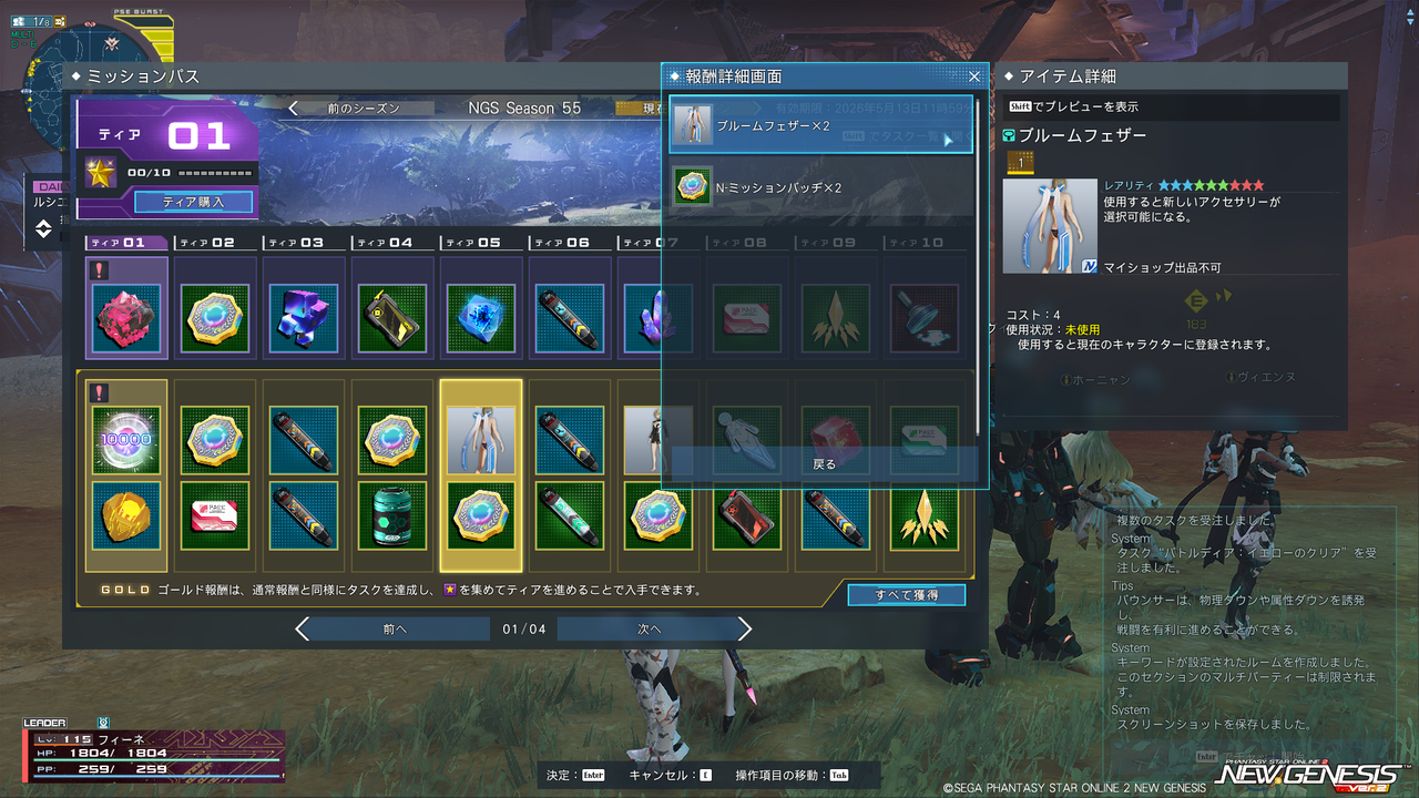 『NGS Season55』が登場。『PSO2』防具だった「ブルームフェザー」のアクセ版や、マルメロの耳を模したアクセ「マルメロヘッドギア」などが入手可能。女性用コスは「ストレガーティ(2パターン)」「フルオレジッパ(3パターン)」。