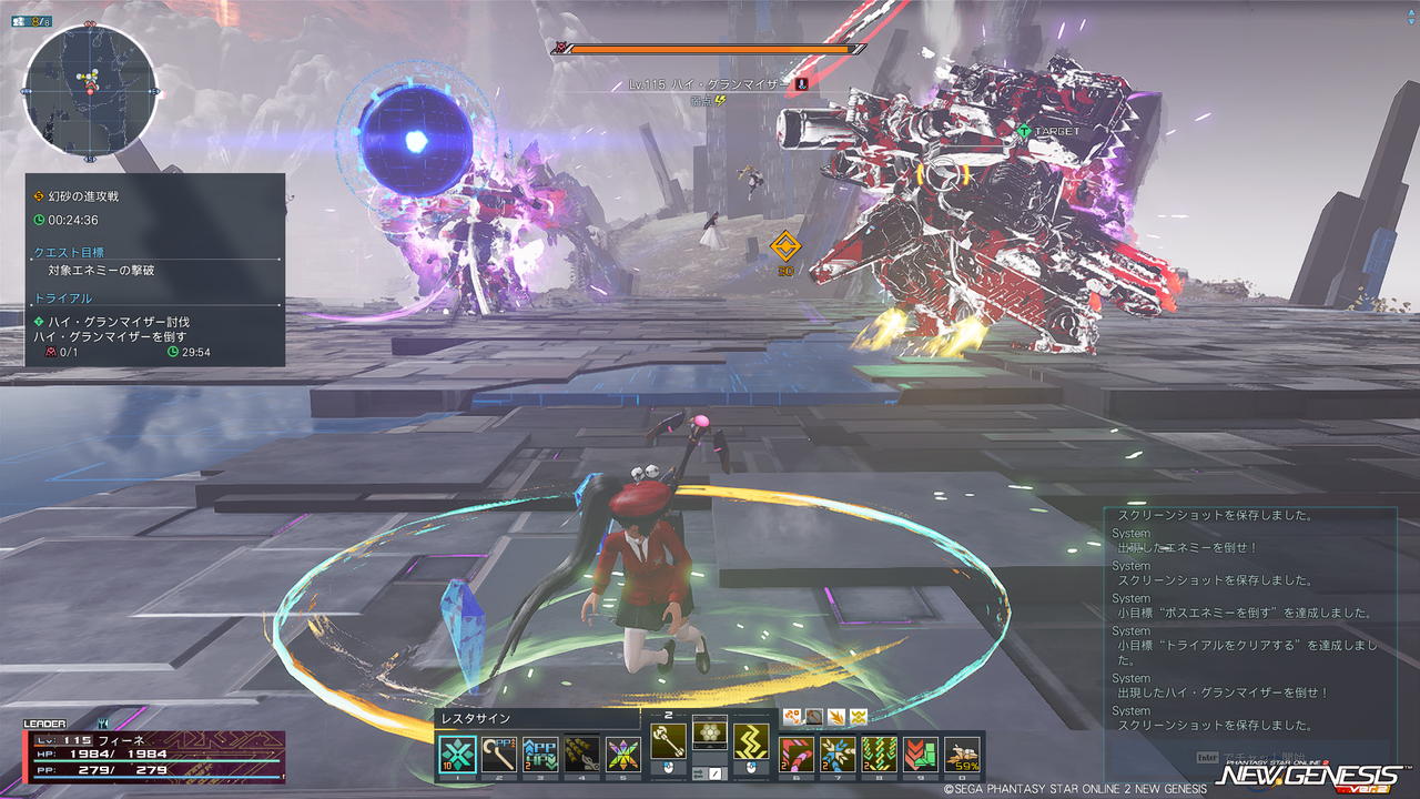 ラストは変わらず「ハイ・グランマイザー」だが、お供が「ハイ・ギルナッチ」×2体のみで追加出現もない。トライアルはハイ・グランマイザーのみが対象だが、ハイ・ギルナッチの回復を考えるとどのみち全部倒すことになりそう。ハイ・ギルナッチ2体を倒すとオルタ・ドロームが湧いて、倒すとフォトンブラストサインが出る。
